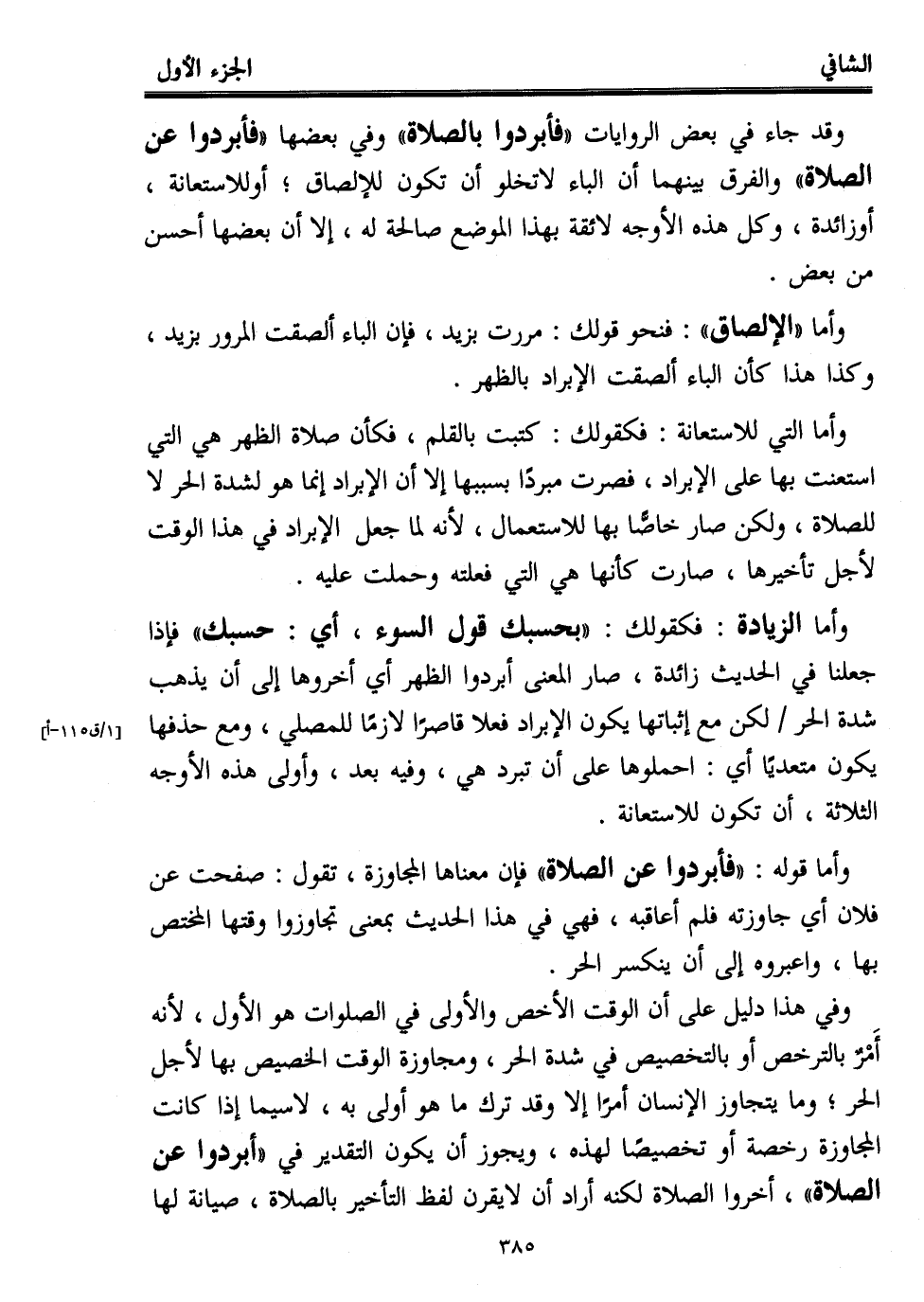 وقد جاء في بعض الروايات "فأبردوا بالصلاة" وفي بعضها "فأبردوا عن الصلاة" والفرق بينهما أن الباء لا تخلو أن تكون للإلصاق؛ أو للاستعانة، أو زائدة، وكل هذه الأوجه لائقة بهذا الموضع صالحة له، إلا أن بعضها أحسن من بعض.