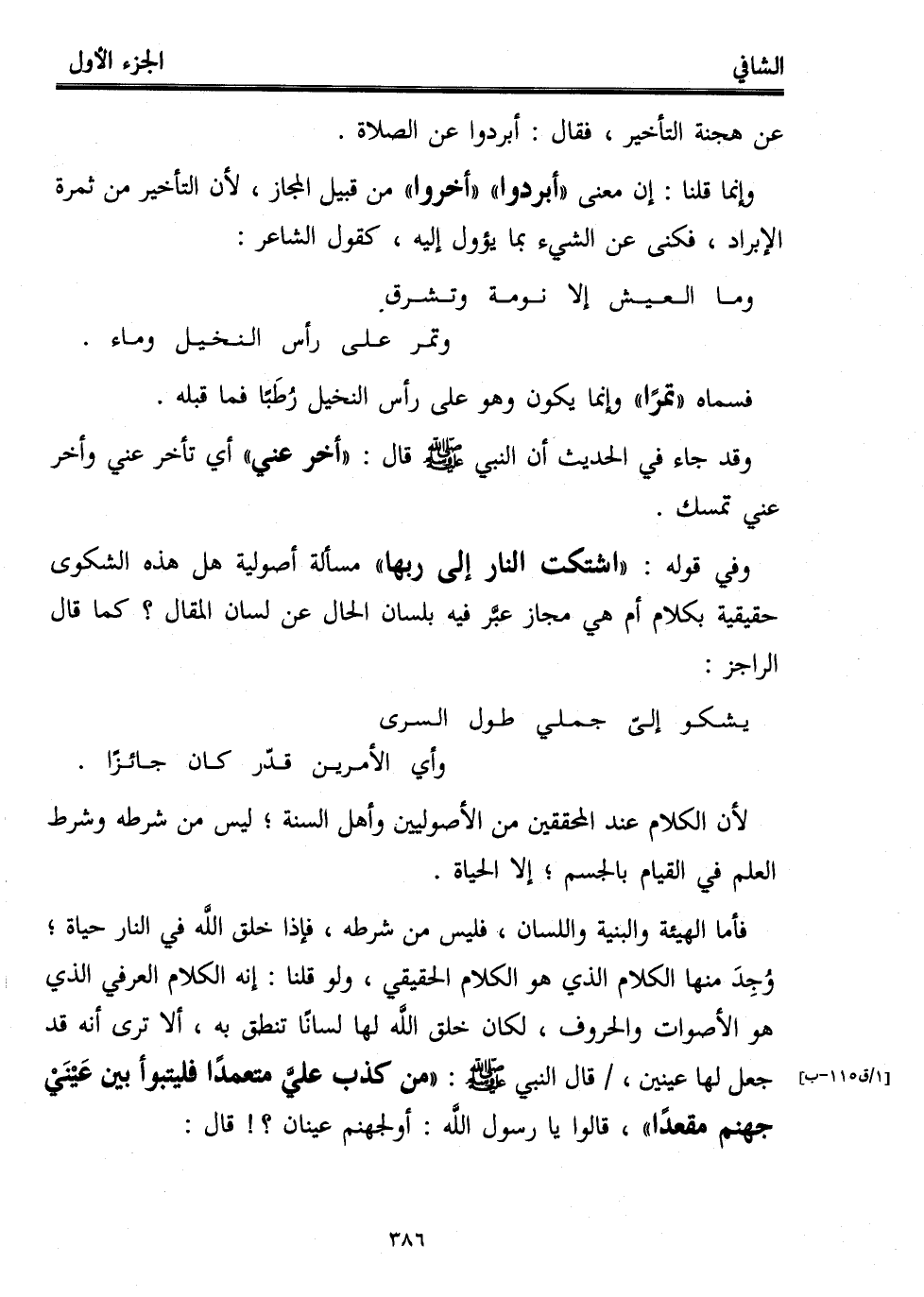 فأما الهيئة والبنية واللسان، فليس من شرطه، فإذا خلق اللَّه في النار حياة؛ وُجِدَ منها الكلام الذي هو الكلام الحقيقي، ولو قلنا: إنه الكلام العرفي الذي هو الأصوات والحروف، لكان خلق اللَّه لها لسانًا تنطق به، ألا ترى أنه قد جعل لها عينين، قال النبي - صلى الله عليه وسلم -: "من كذب عليَّ متعمدًا فليتبوأ بين عَيْنَيْ جهنم مقعدًا"، قالوا يا رسول اللَّه: أو لجهنم عينان؟! قال: