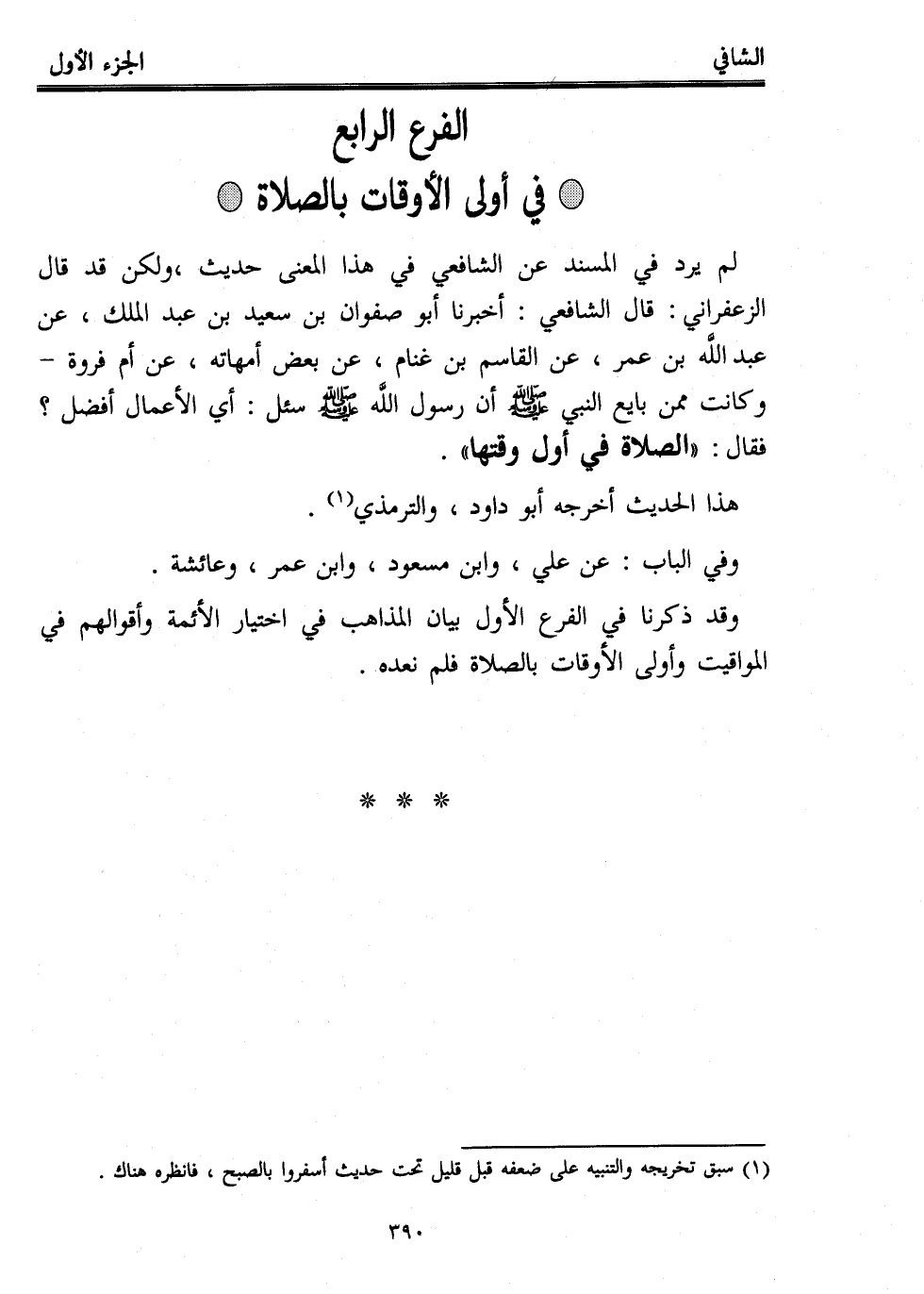 لم يرد في المسند عن الشافعي في هذا المعنى حديث, ولكن قد قال الزعفراني: قال الشافعي: أخبرنا أبو صفوان بن سعيد بن عبد الملك، عن عبد اللَّه بن عمر، عن القاسم بن غنام، عن بعض أمهاته، عن أم فروة -وكانت ممن بايع النبي -صلى الله عليه وسلم -- أن رسول اللَّه - صلى الله عليه وسلم - سئل: أي الأعمال أفضل؟ فقال: "الصلاة في أول وقتها".