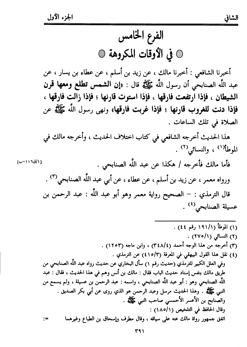 أخبرنا الشافعي: أخبرنا مالك، عن زيد بن أسلم، عن عطاء بن يسار، عن عبد اللَّه الصنابحي أن رسول اللَّه - صلى الله عليه وسلم - قال: "إن الشمس تطلع ومعها قرن الشيطان، فإذا ارتفعت فارقها، فإذا استوت قارنها؛ فإذا زالت فارقها، فإذا دنت للغروب قارنها؛ فإذا غربت فارقها" ونهى رسول اللَّه - صلى الله عليه وسلم - عن الصلاة في تلك الساعات.