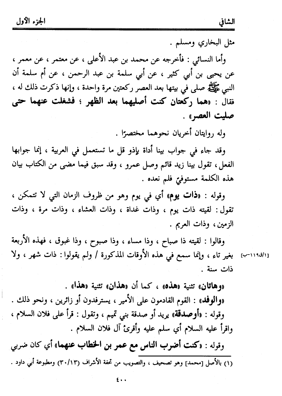 وأما النسائي: فأخرجه عن محمد بن عبد الأعلى، عن معتمر، عن معمر، عن يحيى بن أبي كثير، عن أبي سلمة بن عبد الرحمن، عن أم سلمة أن النبي - صلى الله عليه وسلم - صلى في بيتها بعد العصر ركعتين مرة واحدة، وإنها ذكرت ذلك له، فقال: "هما ركعتان كنت أصليهما بعد الظهر؛ فشغلت عنهما حتى صليت العصر".