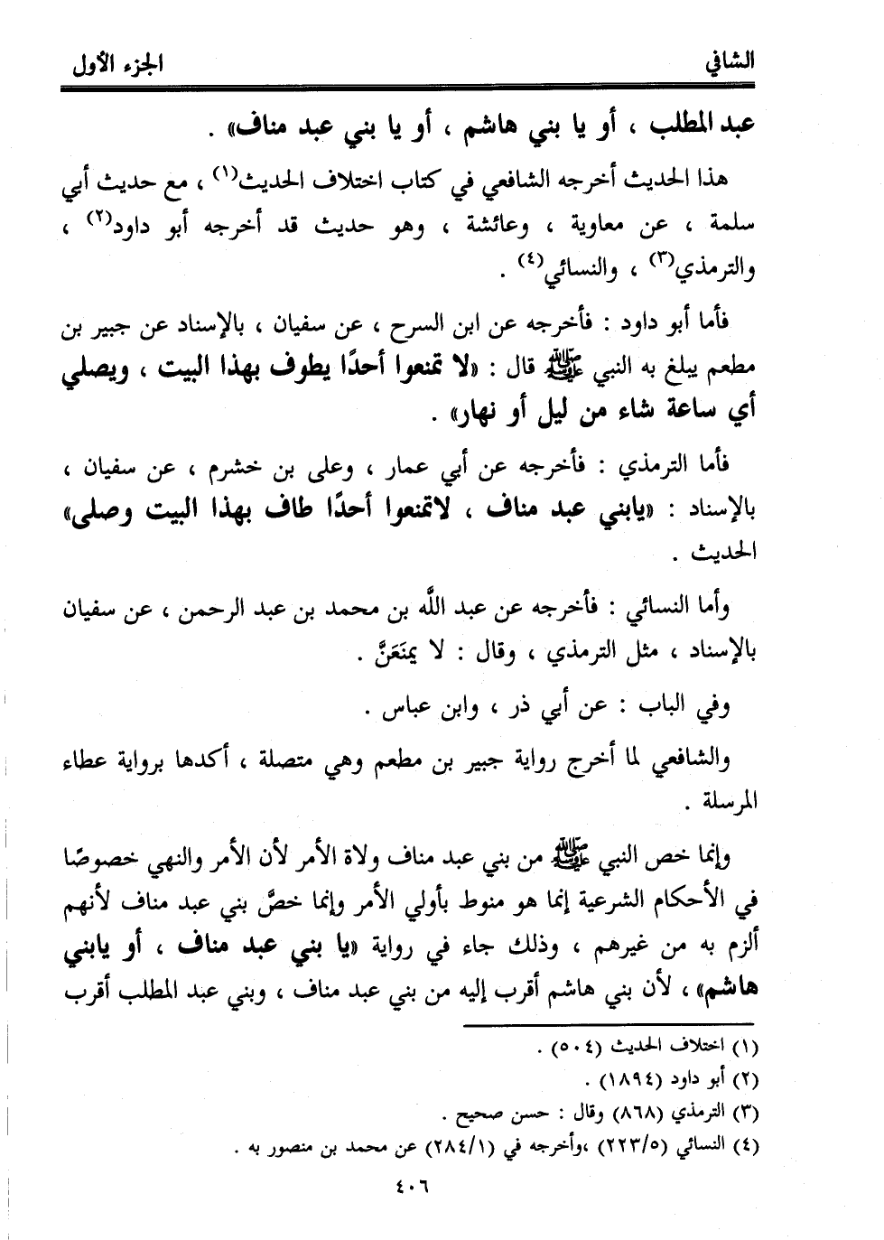 فأما الترمذي: فأخرجه عن أبي عمار، وعلي بن خشرم، عن سفيان، بالإسناد: "يا بني عبد مناف، لا تمنعوا أحدًا طاف بهذا البيت وصلى" الحديث.