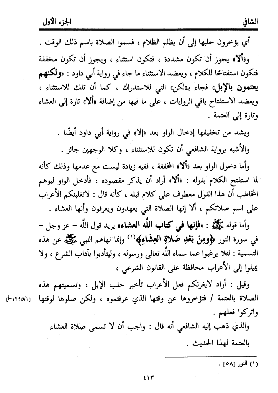 و"ألا" يجوز أن تكون مشددة، فتكون استثناء، ويجوز أن تكون مخففة فتكون استفتاحًا للكلام، ويعضد الاستثناء ما جاء في رواية أبي داود: "ولكنهم يعتمون بالإبل" فجاء بـ "لكن" التي للاستدراك، كما أن تلك للاستثناء، ويعضد الاستفتاح باقي الروايات، على ما فيها من إضافة "ألا" تارة إلى العشاء وتارة إلى العتمة.