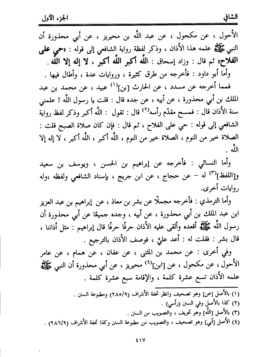 الأحول، عن مكحول، عن عبد اللَّه بن محيريز، عن أبي محذورة أن النبي - صلى الله عليه وسلم - علمه هذا الأذان، وذكر لفظة رواية الشافعي إلى قوله: "حي على الفلاح" ثم قال: وزاد إسحاق: اللَّه أكبر اللَّه أكبر، لا إله إلا اللَّه.
