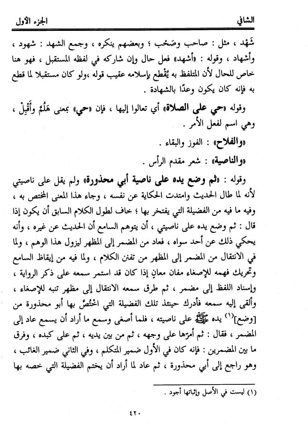 وقوله: "ثم وضع يده على ناصية أبي محذورة" ولم يقل على ناصيتي لأنه لما طال الحديث وامتدت الحكاية عن نفسه، وجاء هذا المعنى المختص به، وفيه ما فيه من الفضيلة التي يفتخر بها؛ خاف لطول الكلام السابق أن يكون إذا قال: ثم وضع يده على ناصيتي، أن يتوهم السامع أن الحديث عن غيره، وأنه يحكي ذلك عن أحد سواه، فعاد من المضمر إلى المظهر ليزول هذا الوهم، ولما في الانتقال من المضمر إلى المظهر من تفنن الكلام، ولما فيه من إيقاظ السامع وتحريك فهمه للإصغاء مفان معانٍ إذا كان قد استمر سمعه على ذكر الرواية, وإسناد اللفظ إلى مضمر، ثم طرق سمعه الانتقال إلى مظهر تنبه للإصغاء، وألقى إليه سمعه فأدرك حينئذ تلك الفضيلة التي اخْتُصَّ بها أبو محذورة من [وضع] (¬1) يده - صلى الله عليه وسلم - على ناصيته، فلما أصغى وسمع ما أراد أن يسمع عاد إلى المضمر، فقال: ثم أمرّها على وجهه، ثم من بين يديه، ثم على كبده، وفرق ما بين المضمرين: فإنه كان في الأول ضمير المتكلم، وفي الثاني ضمير الغائب، وهو راجع إلى أبي محذورة، ثم عاد لما أراد أن يختم الفضيلة التي خصه بها