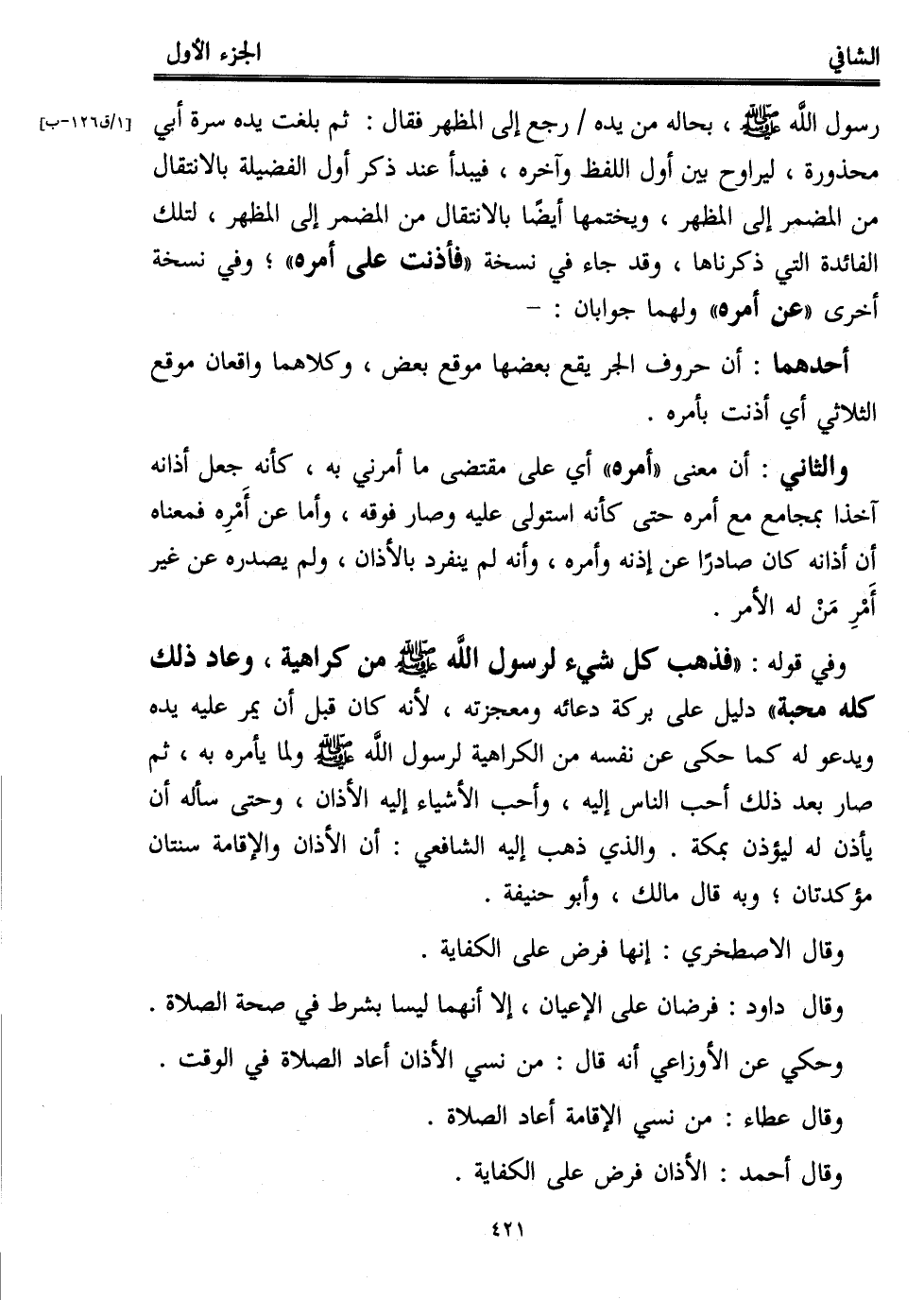 وفي قوله: "فذهب كل شيء لرسول اللَّه - صلى الله عليه وسلم - من كراهية، وعاد ذلك كله محبة" دليل على بركة دعائه ومعجزته، لأنه كان قبل أن يمر عليه يده ويدعو له كما حكى عن نفسه من الكراهية لرسول اللَّه - صلى الله عليه وسلم - ولما يأمره به، ثم صار بعد ذلك أحب الناس إليه، وأحب الأشياء إليه الأذان، وحتى سأله أن يأذن له ليؤذن بمكة. والذي ذهب إليه الشافعي: أن الأذان والإقامة سنتان مؤكدتان؛ وبه قال مالك، وأبو حنيفة.