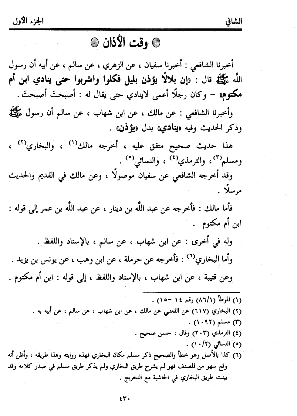 أخبرنا الشافعي: أخبرنا سفيان، عن الزهري، عن سالم، عن أبيه أن رسول اللَّه - صلى الله عليه وسلم - قال: "إن بلالًا يؤذن بليل فكلوا واشربوا حتى ينادي ابن أم مكتوم" وكان رجلاً أعمى لا ينادي حتى يقال له: أصبحتَ أصبحتَ.