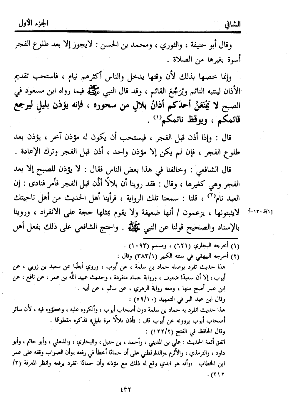 قال الشافعي: وخالفنا في هذا بعض الناس فقال: لا يؤذن للصبح إلا بعد الفجر وهي كغيرها، وقال: فقد روينا أن بلالًا أذن قبل الفجر فأمر فنادى: إن العبد نام (¬2)، قلنا: سمعنا تلك الرواية، فرأينا أهل الحديث من أهل ناحيتك لا يثبتونها، يزعمون أنها ضعيفة ولا يقوم بمثلها حجة على الانفراد، وروينا بالإسناد والصحيح قولنا عن النبي - صلى الله عليه وسلم -. واحتج الشافعي على ذلك بفعل أهل