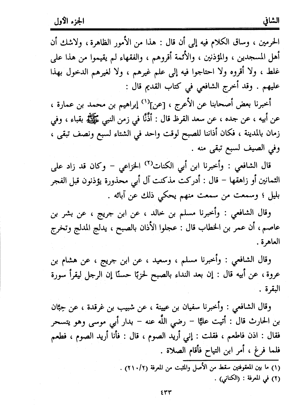 الحرمين، وساق الكلام فيه إلى أن قال: هذا من الأمور الظاهرة، ولا شك أن أهل المسجدين، والمؤذنين، والأئمة أقروهم، والفقهاء لم يقيموا من هذا على غلط، ولا أقروه ولا احتاجوا فيه إلى علم غيرهم، ولا لغيرهم الدخول بهذا عليهم. وقد أخرج الشافعي في كتاب القديم قال: