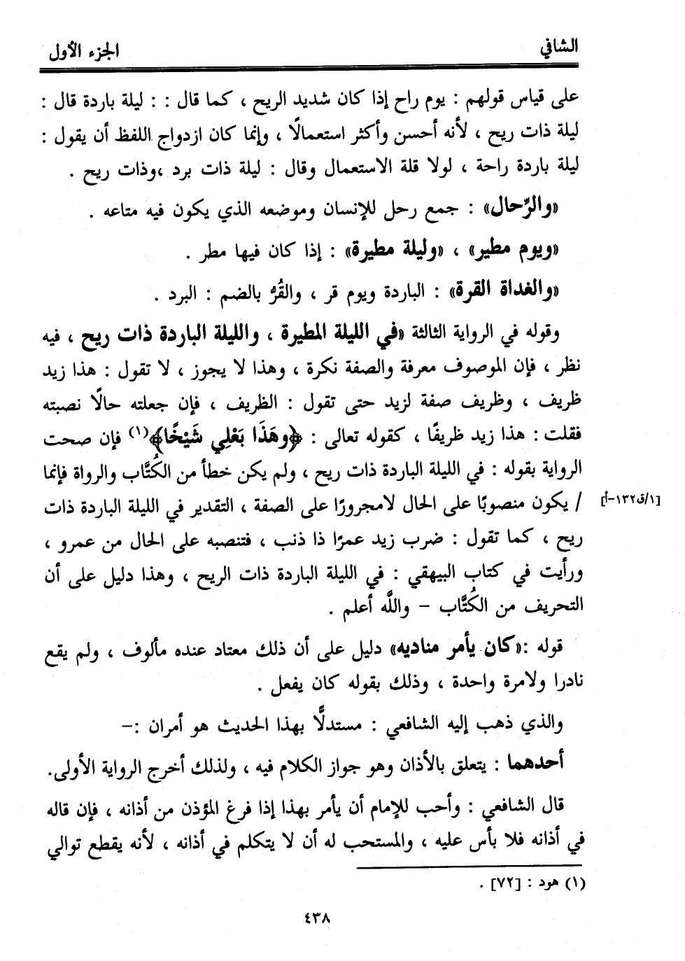 وقوله في الرواية الثالثة "في الليلة المطيرة، والليلة الباردة ذات ريح، فيه نظر، فإن الموصوف معرفة والصفة نكرة، وهذا لا يجوز، لا تقول: هذا زيد ظريف، وظريف صفة لزيد حتى تقول: الظريف، فإن جعلته حالًا نصبته فقلت: هذا زيد ظريفًا، كقوله تعالى: {وَهَذَا بَعْلِي شَيْخًا} (¬1) فإن صحت الرواية بقوله: في الليلة الباردة ذات ريح، ولم يكن خطأ من الكُتَّاب والرواة فإنما يكون منصوبًا على الحال لا مجرورًا على الصفة، التقدير في الليلة الباردة ذات ريح، كما تقول: ضرب زيد عمرًا ذا ذنب، فتنصبه على الحال من عمرو، ورأيت في كتاب البيهقي: في الليلة الباردة ذات الريح، وهذا دليل على أن التحرف من الكُتَّاب- واللَّه أعلم.