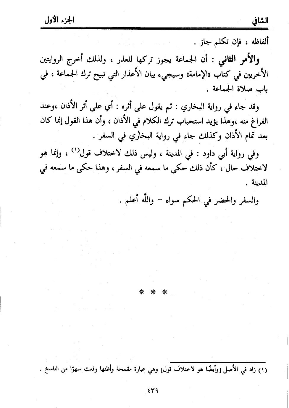 والأمر الثاني: أن الجماعة يجوز تركها للعذر، ولذلك أخرج الروايتين الأخريين في كتاب "الإمامة" وسيجيء بيان الأعذار التي تبيح ترك الجماعة، في باب صلاة الجماعة.