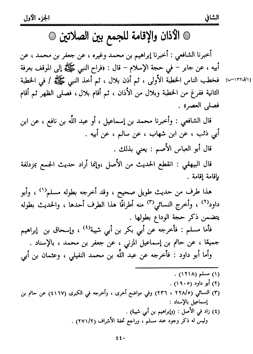 أخبرنا الشافعي: أخبرنا إبراهيم بن محمد وغيره، عن جعفر بن محمد، عن أبيه، عن جابر -في حجة الإسلام- قال: "فراح النبي - صلى الله عليه وسلم - إلى الموقف بعرفة فخطب الناس الخطبة الأولى، ثم أذن بلال، ثم أخذ النبي - صلى الله عليه وسلم - في الخطبة الثانية ففرغ من الخطة وبلال من الأذان، ثم أقام بلال، فصلى الظهر ثم أقام فصلى العصر".