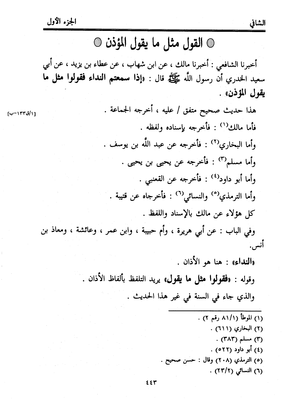 أخبرنا الشافعي: أخبرنا مالك، عن ابن شهاب، عن عطاء بن يزيد، عن أبي سعيد الخدري أن رسول اللَّه - صلى الله عليه وسلم - قال: "إذا سمعتم النداء فقولوا مثل ما يقول المؤذن".