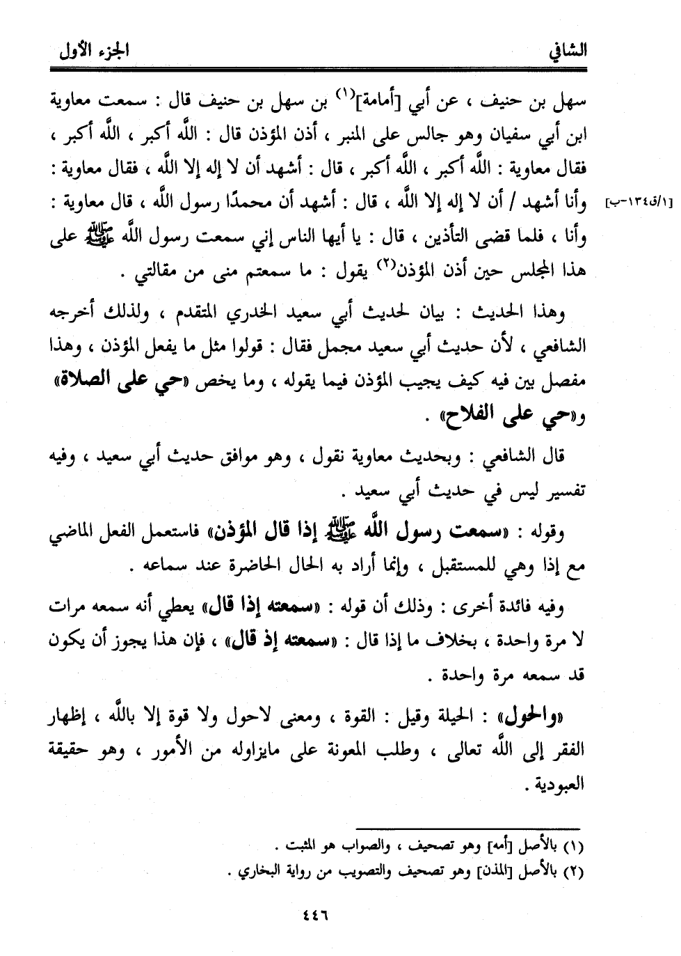 وهذا الحديث: بيان لحديث أبي سعيد الخدري المتقدم، ولذلك أخرجه الشافعي، لأن حديث أبي سعيد مجمل فقال: قولوا مثل ما يفعل المؤذن، وهذا مفصل بين فيه كيف يجيب المؤذن فيما يقوله، وما يخص "حي على الصلاة" و "حي على الفلاح".
