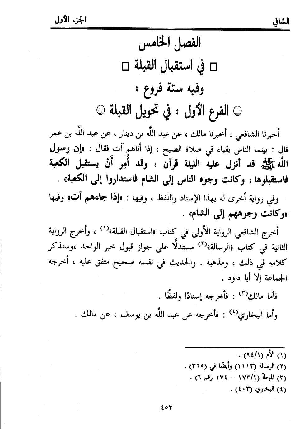 أخبرنا الشافعي: أخبرنا مالك، عن عبد اللَّه بن دينار، عن عبد اللَّه بن عمر قال: بينما الناس بقباء في صلاة الصبح، إذا أتاهم آت فقال: "إن رسول اللَّه - صلى الله عليه وسلم - قد أنزل عليه الليلة قرآن، وقد أُمِر أن يستقبل الكعبة فاستقبلوها، وكانت وجوه الناس إلى الشام فاستداروا إلى الكعبة".