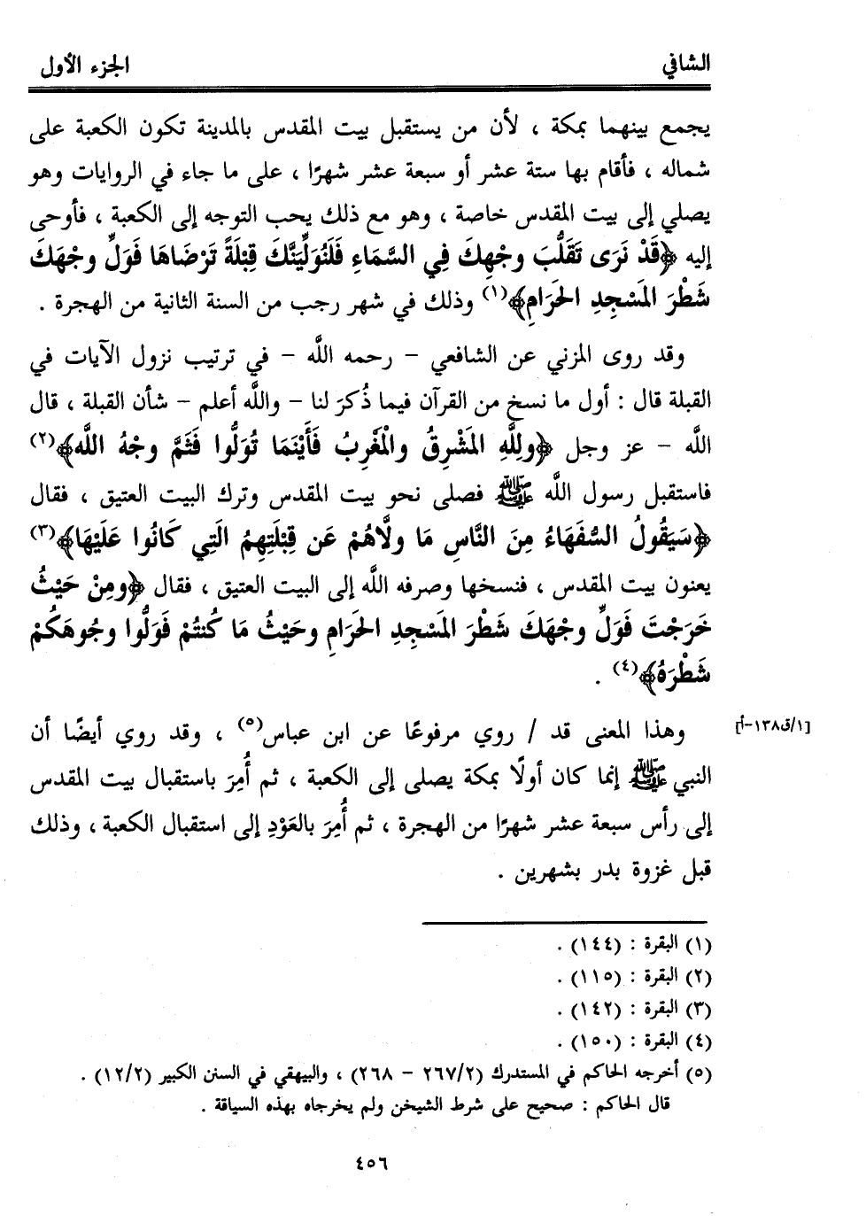وقد روى المزني عن الشافعي -رحمه اللَّه- في ترتيب نزول الآيات في القبلة قال: أول ما نسخ من القرآن فيما ذُكر لنا -واللَّه أعلم- شأن القبلة، قال اللَّه -عز وجل {وَلِلَّهِ الْمَشْرِقُ وَالْمَغْرِبُ فَأَيْنَمَا تُوَلُّوا فَثَمَّ وَجْهُ اللَّهِ} (¬2) فاستقبل رسول اللَّه - صلى الله عليه وسلم - فصلى نحو بيت المقدس وترك البيت العتيق، فقال {سَيَقُولُ السُّفَهَاءُ مِنَ النَّاسِ مَا وَلَّاهُمْ عَنْ قِبْلَتِهِمُ الَّتِي كَانُوا عَلَيْهَا} (¬3) يعنون بيت المقدس، فنسخها وصرفه اللَّه إلى البيت العتيق، فقال {وَمِنْ حَيْثُ خَرَجْتَ فَوَلِّ وَجْهَكَ شَطْرَ الْمَسْجِدِ الْحَرَامِ وَحَيْثُ مَا كُنْتُمْ فَوَلُّوا وُجُوهَكُمْ شَطْرَهُ} (¬4).