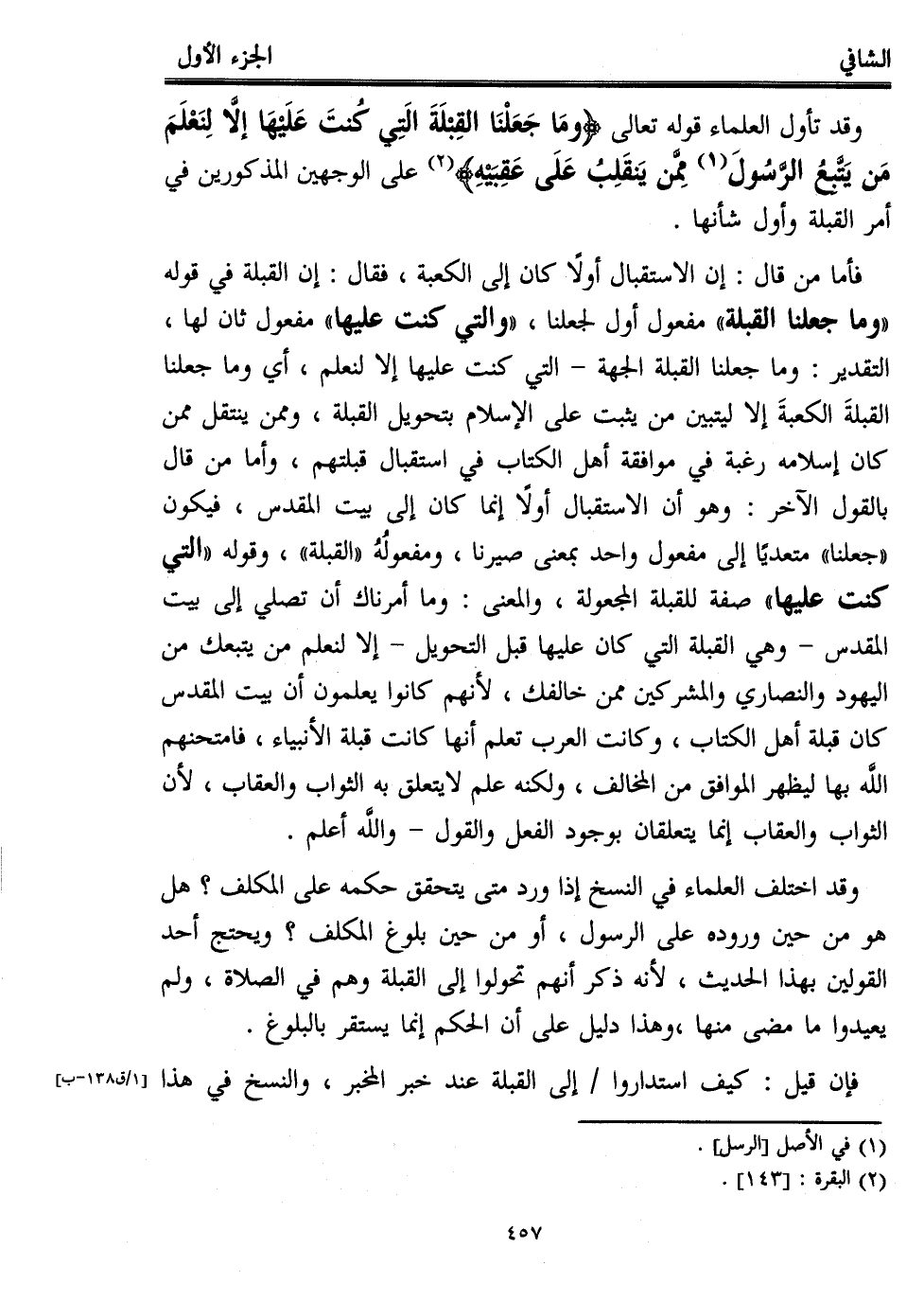 فأما من قال: إن الاستقبال أولاً كان إلى الكعبة، فقال: إن القبلة في قوله "وما جعلنا القبلة" مفعول أول لجعلنا، "والتي كنت عليها" مفعول ثان لها، التقدير: وما جعلنا القبلة الجهة -التي كنت عليها إلا لنعلم، أي وما جعلنا القبلة الكعبة إلا ليتبين من يثبت على الإسلام بتحويل القبلة، وممن ينتقل ممن كان إسلامه رغبة في موافقة أهل الكتاب في استقبال قبلتهم، وأما من قال بالقول الآخر: وهو أن الاستقبال أولًا إنما كان إلى بيت المقدس، فيكون "جعلنا" متعديًا إلى مفعول واحد بمعنى صيرنا، ومفعولُهُ "القبلة"، وقوله "التي كنت عليها" صفة للقبلة المجعولة، والمعنى: وما أمرناك أن تصلي إلى بيت المقدس -وهي القبلة التي كان عليها قبل التحويل- إلا لنعلم من يتبعك من اليهود والنصاري والمشركين ممن خالفك، لأنهم كانوا يعلمون أن بيت المقدس كان قبلة أهل الكتاب، وكانت العرب تعلم أنها كانت قبلة الأنبياء، فامتحنهم اللَّه بها ليظهر الموافق من المخالف، ولكنه علم لا يتعلق به الثواب والعقاب، لأن الثواب والعقاب إنما يتعلقان بوجود الفعل والقول -واللَّه أعلم.