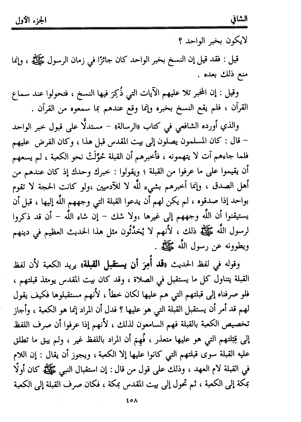 والذي أورده الشافعي في كتاب "الرسالة" -مستدلًّا على قبول خبر الواحد- قال: كان المسلمون يصلون إلى بيت المقدس قبل هذا، وكان الفرض عليهم فلما جاءهم آت لا يتهمونه، فأخبرهم أن القبلة حُوِّلَتْ نحو الكعبة، لم يسعهم أن يقيموا على ما عرفوا من القبلة؛ ويقولوا: خبرك وحدك إذ كان عندهم من أهل الصدق، وإنما أخبرهم بشيء للَّه لا للآدميين، ولو كانت الحجة لا تقوم بواحد إذا صدقوه، لم يكن لهم أن يدعوا القبلة التي وجههم اللَّه إليها، قبل أن يستيقنوا أن اللَّه وجههم إلى غيرها, ولا شك -إن شاء اللَّه- أن قد ذكروا لرسول اللَّه - صلى الله عليه وسلم - ذلك، لأنهم لا يُحَدَّثُون مثل هذا الحديث العظيم في دينهم ويطوونه عن رسول اللَّه - صلى الله عليه وسلم -.