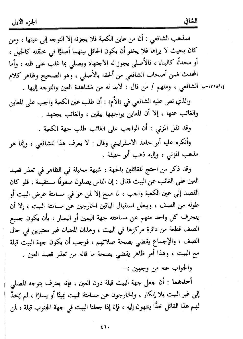 أحدهما: أن جعل جهة البيت قبلة دون العين، فإنه يعترف بتوجه المصلي إلى غير البيت بلا إنكار، والخارجون عن مسامتة البيت يمينًا أو يسارًا، لم يُحَدَّ لهم هذا القائل حَدًّا ينتهون إليه، فإنا إذا جعلنا البيت في جهة الجنوب قبلة، لمن
