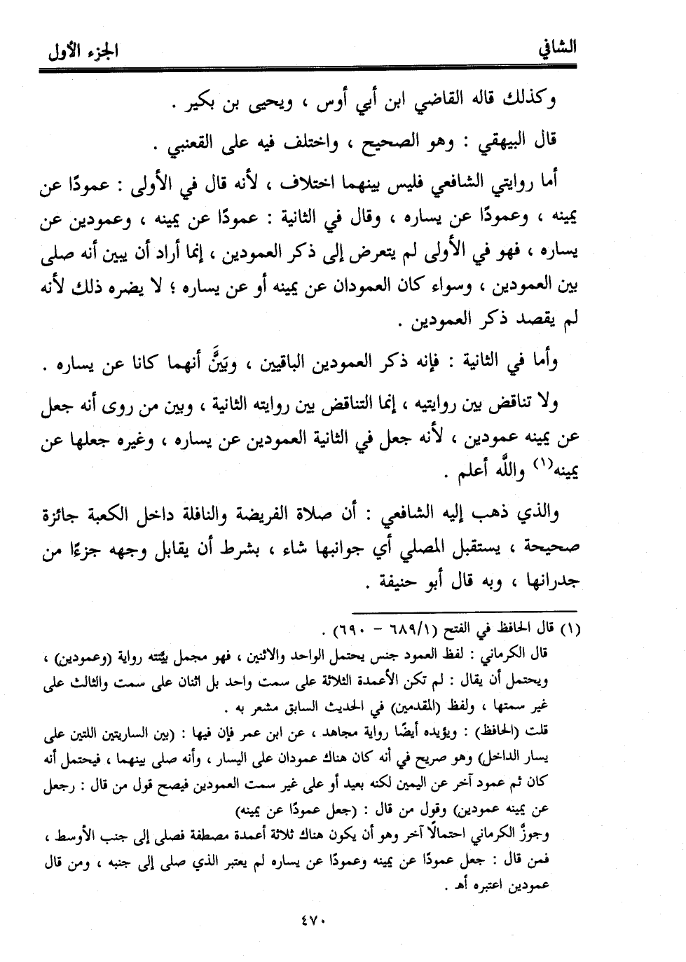 أما روايتي الشافعي فليس بينهما اختلاف، لأنه قال في الأولى: عمودًا عن يمينه، وعمودًا عن يساره، وقال في الثانية: عمودًا عن يمينه، وعمودين عن يساره، فهو في الأولى لم يتعرض إلى ذكر العمودين، إنما أراد أن يبين أنه صلى بين العمودين، وسواء كان العمودان عن يمينه أو عن يساره؛ لا يضره ذلك لأنه لم يقصد ذكر العمودين.