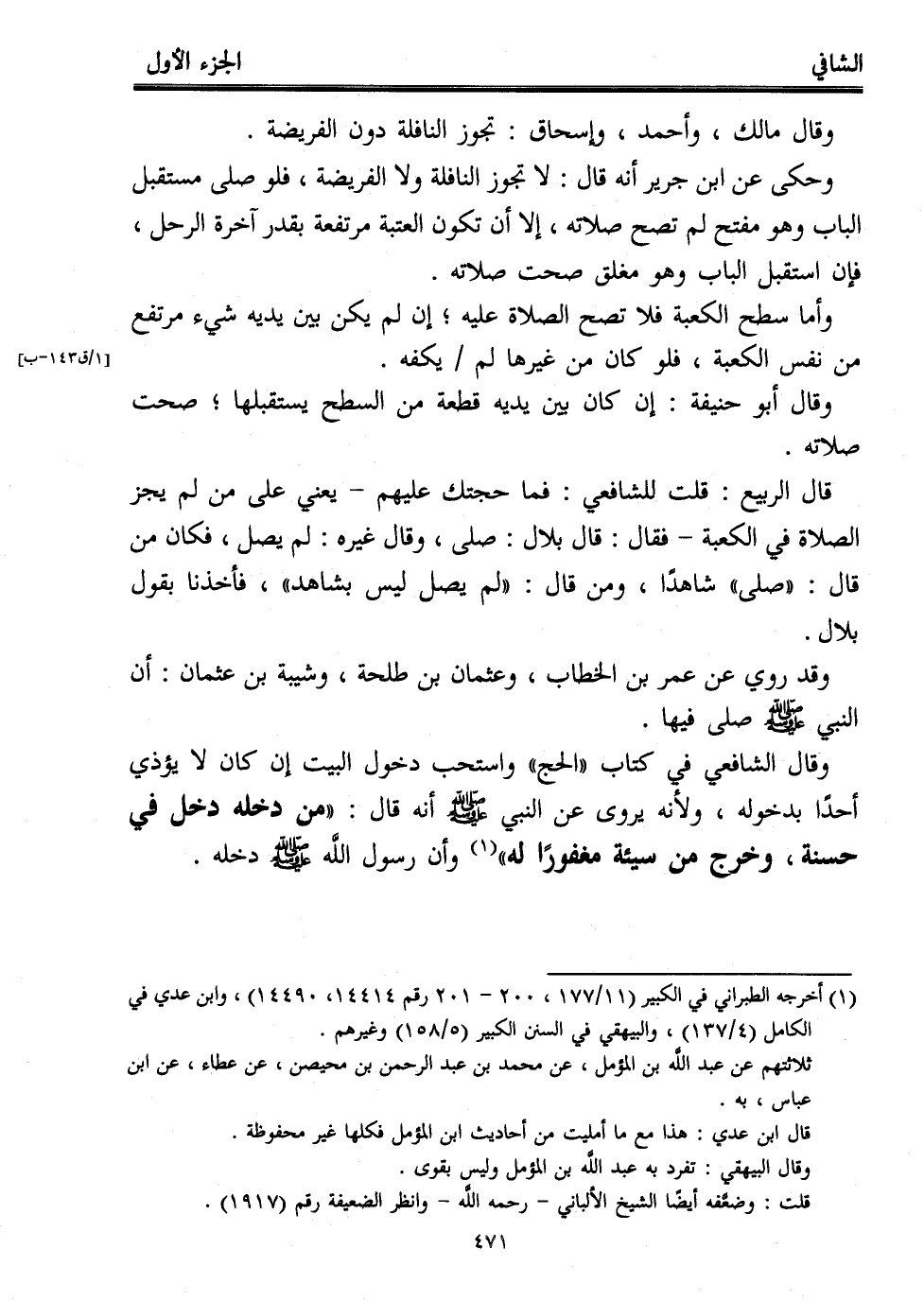 قال الربيع: قلت للشافعي: فما حجتك عليهم -يعني على من لم يجز الصلاة في الكعبة- فقال: قال بلال: صلى، وقال غيره: لم يصل، فكان من قال: "صلى" شاهدًا، ومن قال: "لم يصل ليس بشاهد"، فأخذنا يقول بلال.