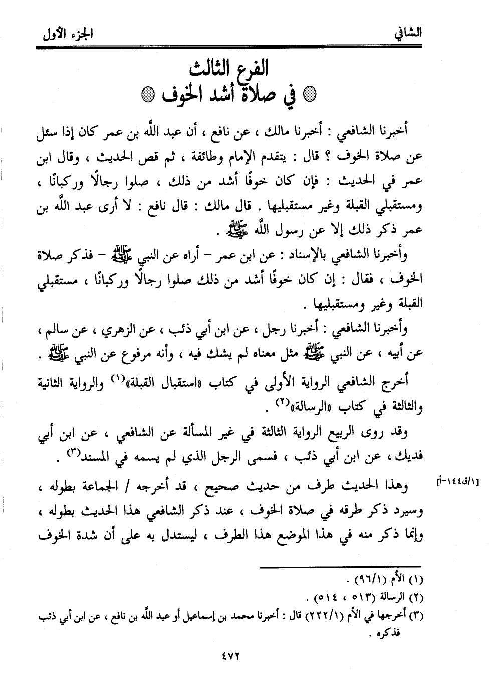 وهذا الحديث طرف من حديث صحيح، قد أخرجه الجماعة بطوله، وسيرد ذكر طرقه في صلاة الخوف، عند ذكر الشافعي هذا الحديث بطوله، وإنما ذكر منه في هذا الموضع هذا الطرف، ليستدل به على أن شدة الخوف