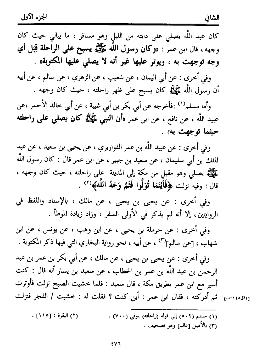 وفي أخرى: عن عبيد اللَّه بن عمر القواريري، عن يحيى بن سعيد، عن عبد الملك بن أبي سليمان، عن سعيد بن جبير، عن ابن عمر قال: كان رسول اللَّه - صلى الله عليه وسلم - يصلي وهو مقبل من مكة إلى المدينة على راحلته، حيث كان وجهه، قال: وفيه نزلت {فَأَيْنَمَا تُوَلُّوا فَثَمَّ وَجْهُ اللَّهِ} (¬2).
