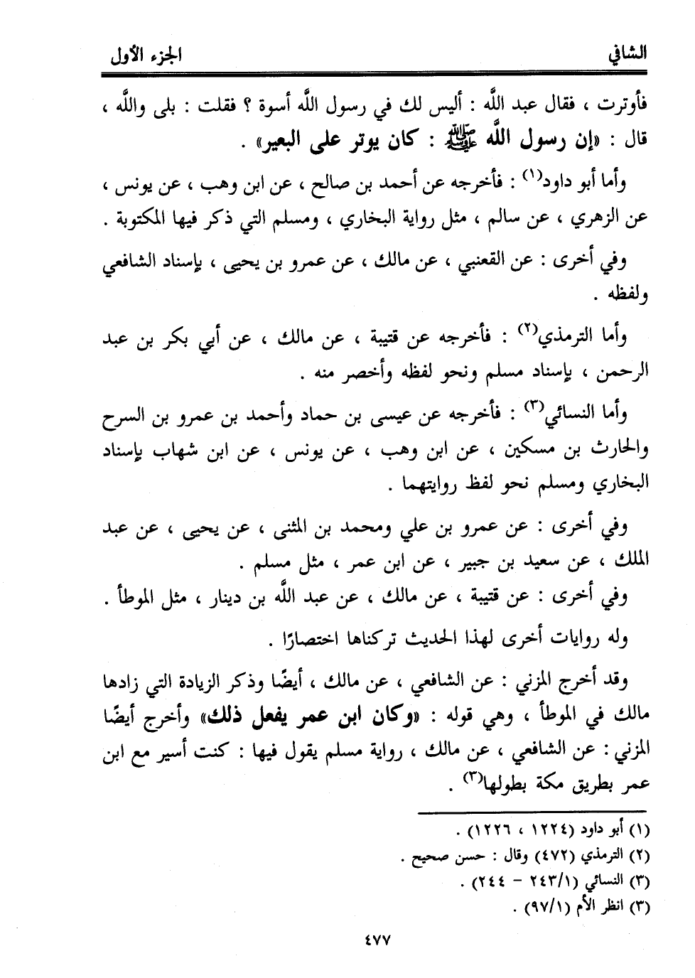 فأوترت، فقال عبد اللَّه: أليس لك في رسول اللَّه أسوة؟ فقلت: بلى واللَّه، قال: "إن رسول اللَّه - صلى الله عليه وسلم -: كان يوتر على البعير".