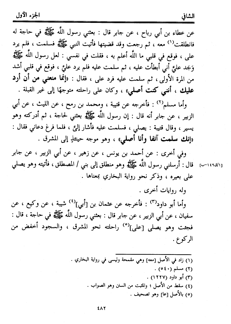 وأما مسلم (¬2): فأخرجه عن قتيبة، ومحمد بن رمح، عن الليث، عن أبي الزبير، عن جابر أنه قال: إن رسول اللَّه - صلى الله عليه وسلم - بعثني لحاجة، ثم أدركته وهو يسير، وقال قتيبة: يصلي، فسلمت عليه فأشار إليَّ، فلما فرغ دعاني فقال: "إنك سلمت آنفا وأنا أصلي"، وهو موجه حينئذٍ إلى المشرق.