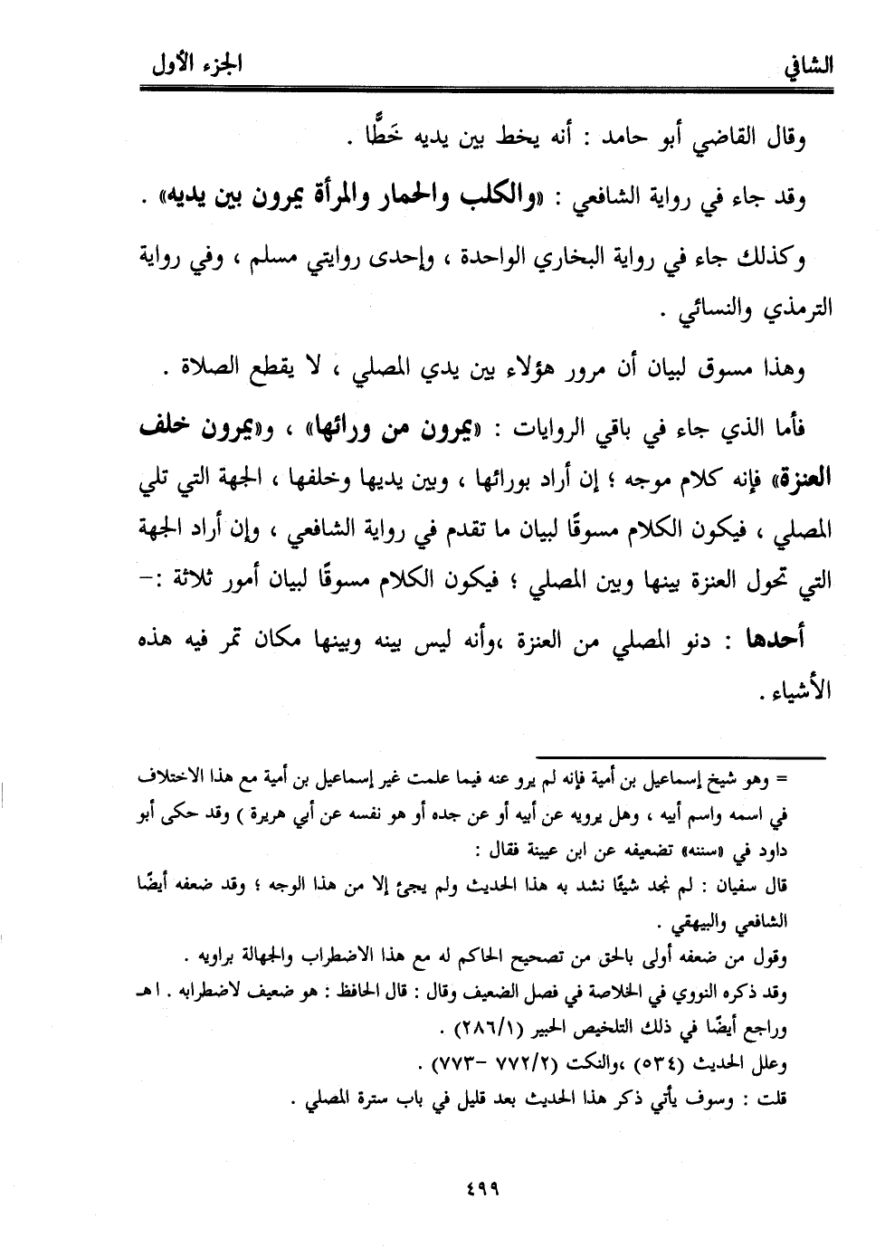 فأما الذي جاء في باقي الروايات: "يمرون من ورائها"، و"يمرون خلف العنزة" فإنه كلام موجه؛ إن أراد بورائها، وبين يديها وخلفها، الجهة التي تلي المصلي، فيكون الكلام مسوقًا لبيان ما تقدم في رواية الشافعي، وإن أراد الجهة التي تحول العنزة بينها وبين المصلي؛ فيكون الكلام مسوقًا لبيان أمور ثلاثة:-
