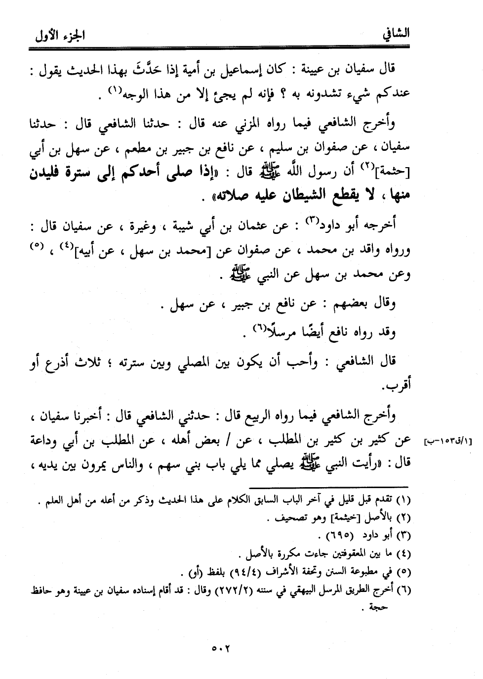 وأخرج الشافعي فيما رواه الربيع قال: حدثني الشافعي قال: أخبرنا سفيان، عن كثير بن كثير بن المطلب، عن بعض أهله، عن المطلب بن أبي وداعة قال: "رأيت النبي - صلى الله عليه وسلم - يصلي مما يلي باب بني سهم، والناس يمرون بين يديه،