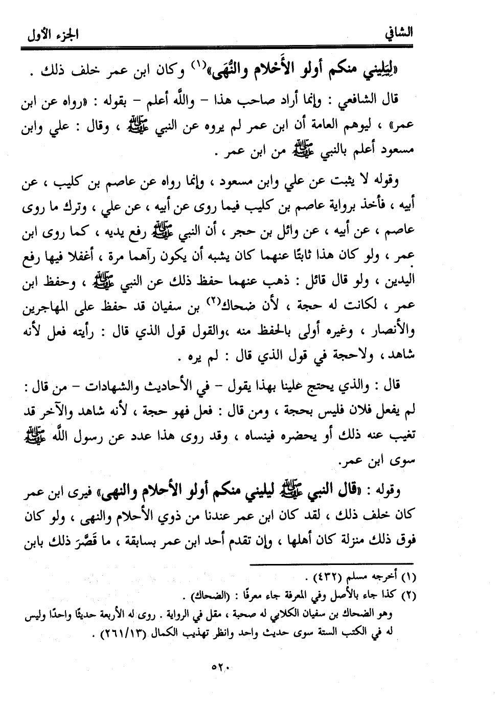 وقوله: "قال النبي - صلى الله عليه وسلم - ليليني منكم أولو الأحلام والنهى" فيرى ابن عمر كان خلف ذلك، لقد كان ابن عمر عندنا من ذوي الأحلام والنهى، ولو كان فوق ذلك منزلة كان أهلها، وإن تقدم أحد ابن عمر بسابقة، ما قَصَّرَ ذلك بابن