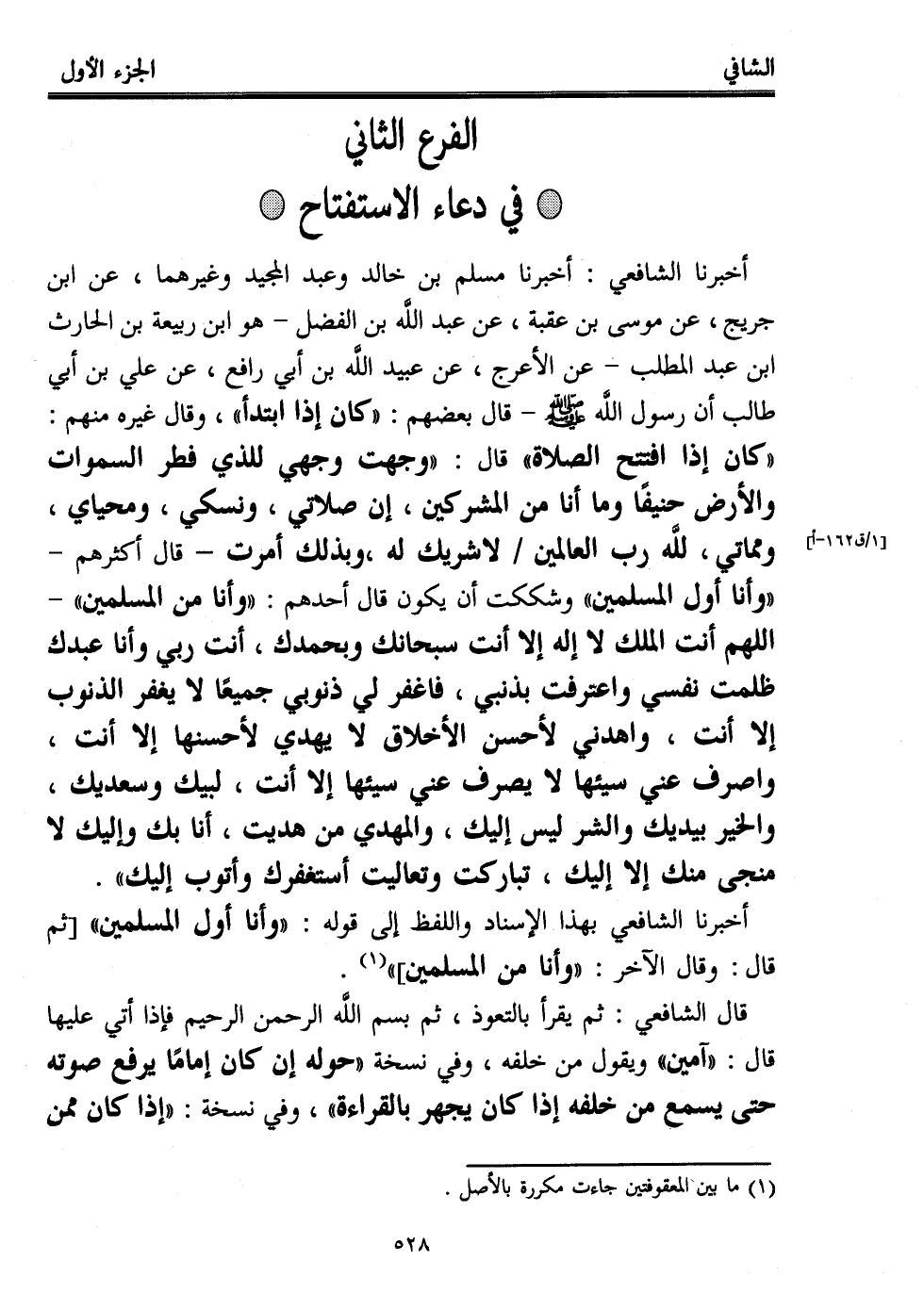 أخبرنا الشافعي: أخبرنا مسلم بن خالد وعبد المجيد وغيرهما، عن ابن جريج، عن موسى بن عقبة، عن عبد اللَّه بن الفضل - هو ابن ركعة بن الحارث ابن عبد المطلب- عن الأعرج، عن عبيد اللَّه بن أبي رافع، عن علي بن أبي طالب أن رسول اللَّه - صلى الله عليه وسلم - قال بعضهم: "كان إذا ابتدأ"، وقال غيره منهم: "كان إذا افتتح الصلاة" قال: "وجهت وجهي للذي فطر السموات والأرض حنيفًا وما أنا من المشركين، إن صلاتي، ونسكي، ومحياي، ومماتي، للَّه رب العالمين لا شريك له، وبذلك أمرت -قال أكثرهم- "وأنا أول المسلمين" وشككت أن يكون قال أحدهم: -"وأنا من المسلمين"- اللهم أنت الملك لا إله إلا أنت سبحانك وبحمدك، أنت ربي وأنا عبدك ظلمت نفسي واعترفت بذنبي، فاغفر لي ذنوبي جميعًا لا يغفر الذنوب إلا أنت، واهدني لأحسن الأخلاق لا يهدي لأحسنها إلا أنت، واصرف عني سيئها لا يصرف عني سيئها إلا أنت، لبيك وسعديك، والخير بيديك والشر ليس إليك، والمهدي من هديت، أنا بك وإليك لا منجى منك إلا إليك، تباركت وتعاليت أستغفرك وأتوب إليك".