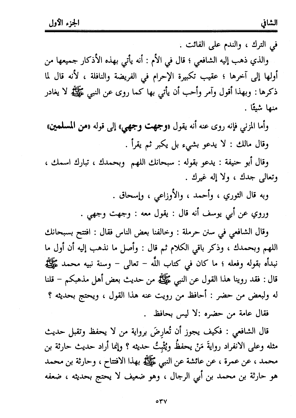 وقال الشافعي في سنن حرملة: وخالفنا بعض الناس فقال: افتتح بسبحانك اللهم وبحمدك، وذكر باقي الكلام ثم قال: وأصل ما نذهب إليه أن أول ما نبدأه بقوله وفعله؛ ما كان في كتاب اللَّه -تعالى- وسنة نبيه محمد - صلى الله عليه وسلم - قال: فقد روينا هذا القول عن النبي - صلى الله عليه وسلم - من حديث بعض أهل مذهبكم -قلنا له ولبعض من حضر: أحافظ من رويت عنه هذا القول، ويحتج بحديثه؟ فقال عامة من حضره: لا ليس بحافظ.
