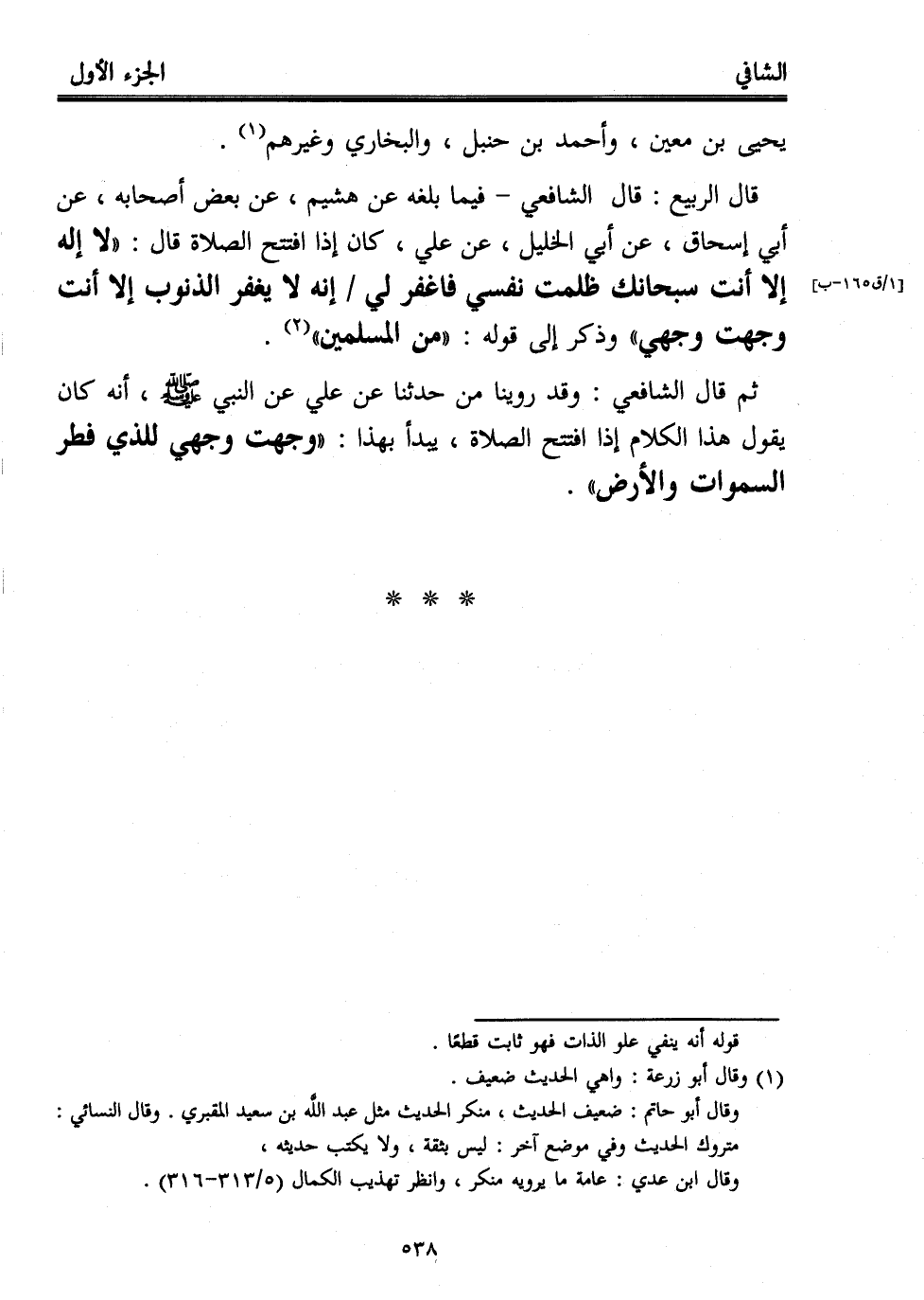 ثم قال الشافعي: وقد روينا من حدثنا عن علي عن النبي - صلى الله عليه وسلم -، أنه كان يقول هذا الكلام إذا افتتح الصلاة، يبدأ بهذا: "وجهت وجهي للذي فطر السموات والأرض".