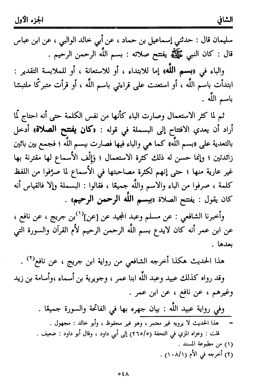وأخبرنا الشافعي: عن مسلم وعبد المجيد عن [عن] (¬1) بن جريج، عن نافع، عن ابن عمر أنه كان لايدع بسم اللَّه الرحمن الرحيم لأم القرآن والسورة التي بعدها.