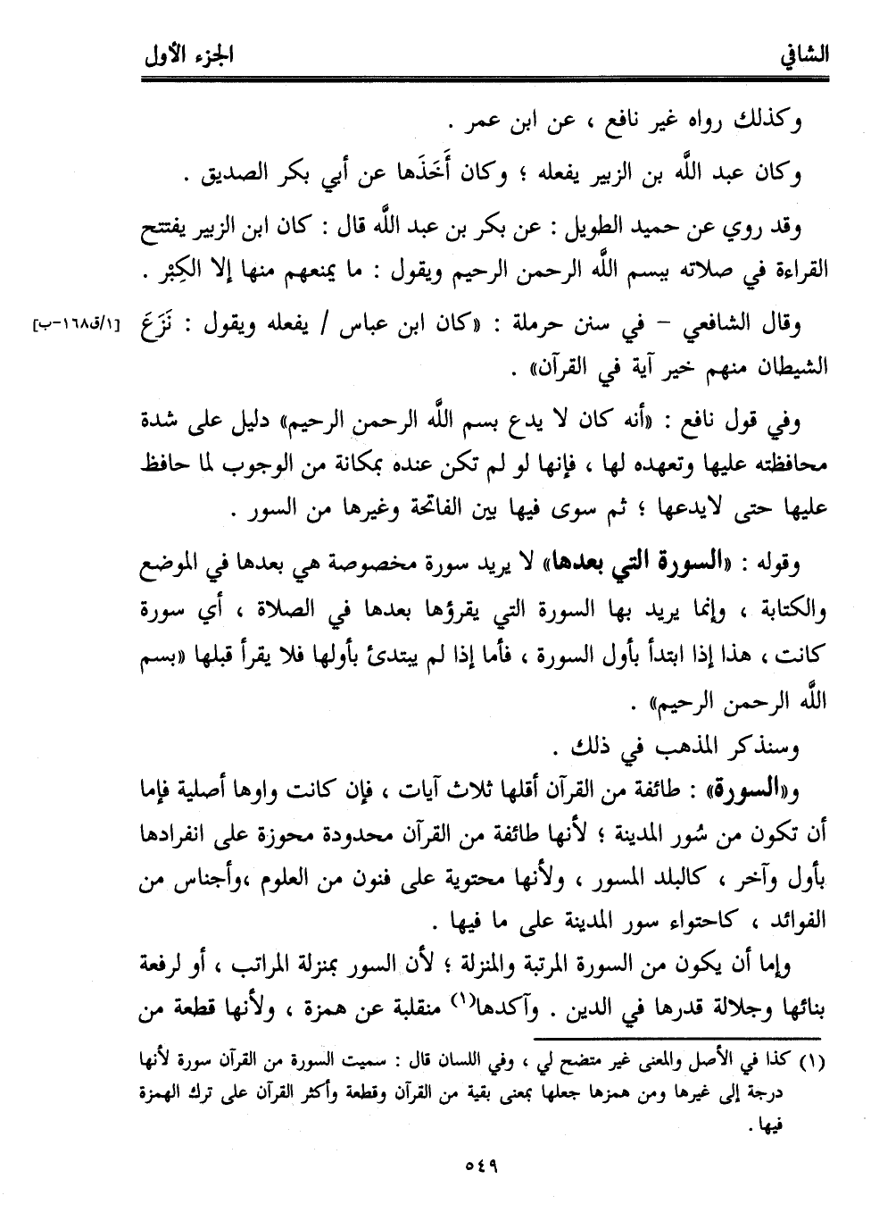 وفي قول نافع: "أنه كان لا يدع بسم اللَّه الرحمن الرحيم" دليل على شدة محافظته عليها وتعهده لها، فإنها لو لم تكن عنده بمكانة من الوجوب لما حافظ عليها حتى لايدعها؛ ثم سوى فيه بين الفاتحة وغيرها من السور.