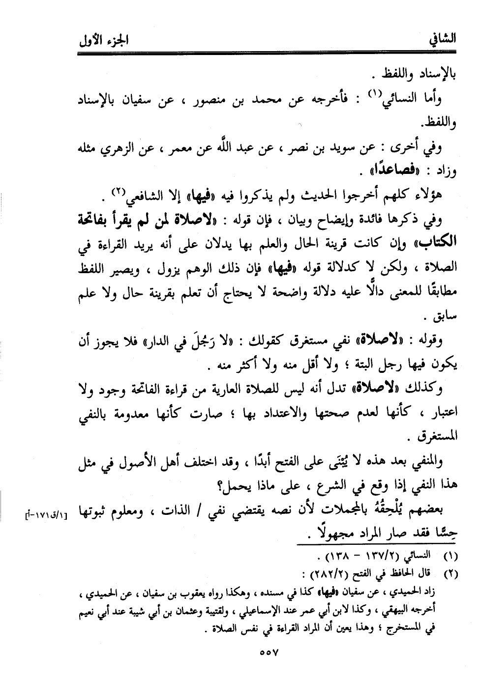 وقوله: "لا صلاة" نفي مستغرق كقولك: "لا رَجُلَ في الدار" فلا يجوز أن يكون فيها رجل البتة؛ ولا أقل منه ولا أكثر منه. وكذلك "لا صلاة" تدل أنه ليس للصلاة العارية من قراء الفاتحة وجود ولا اعتبار، كأنها لعدم صحتها والاعتداد بها؛ صارت كأنها معدومة بالنفي المستغرق.