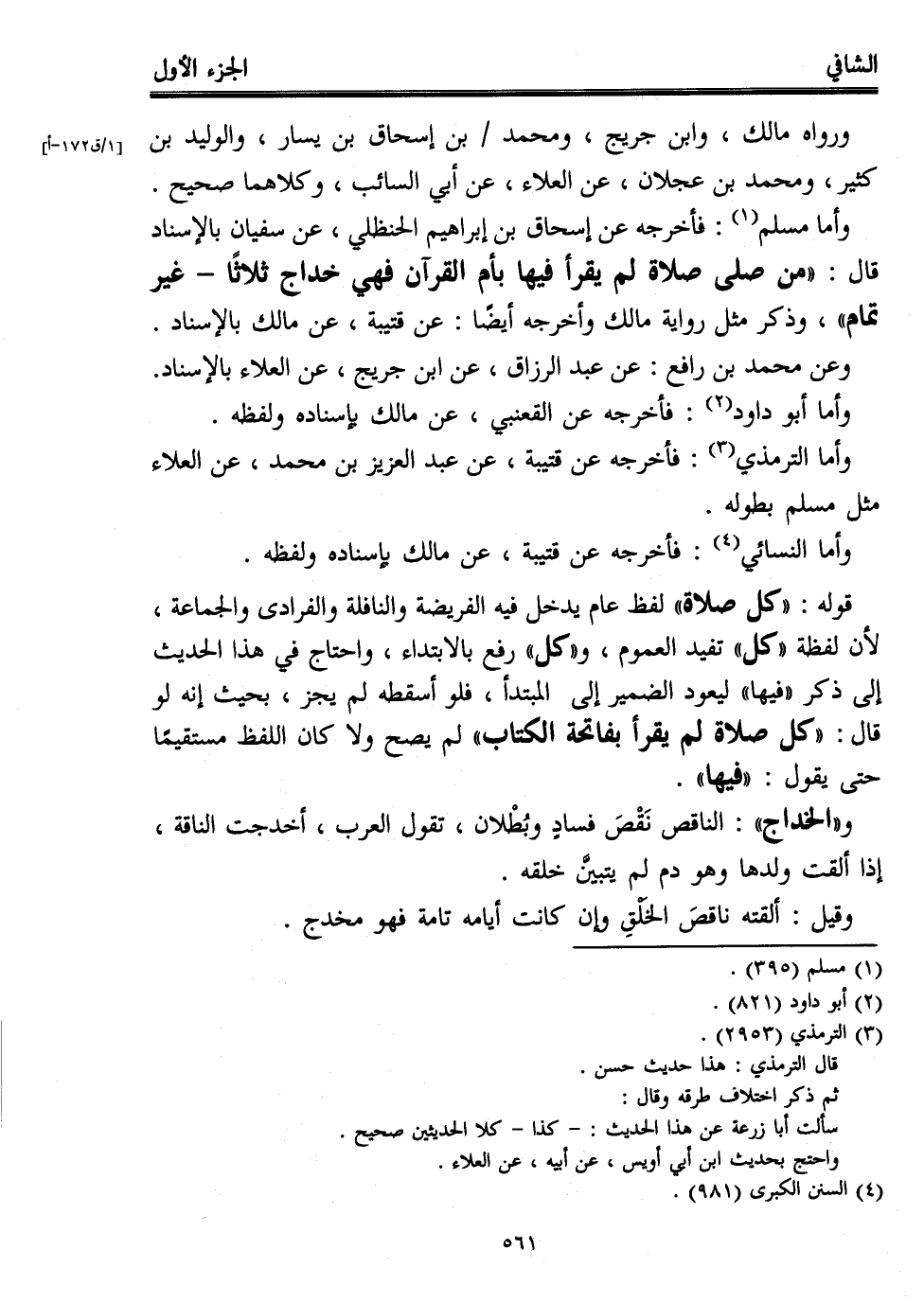 قوله: "كل صلاة" لفظ عام يدخل فيه الفريضة والنافلة والفرادى والجماعة، لأن لفظة "كل" تفيد العموم، و "كل" رفع بالابتداء، واحتاج في هذا الحديث إلى ذكر "فيها" ليعود الضمير إلى المبتدأ، فلو أسقطه لم يجز، بحيث إنه لو قال: "كل صلاة لم يقرأ بفاتحة الكتاب" لم يصح ولا كان اللفظ مستقيمًا حتى يقول: "فيها".