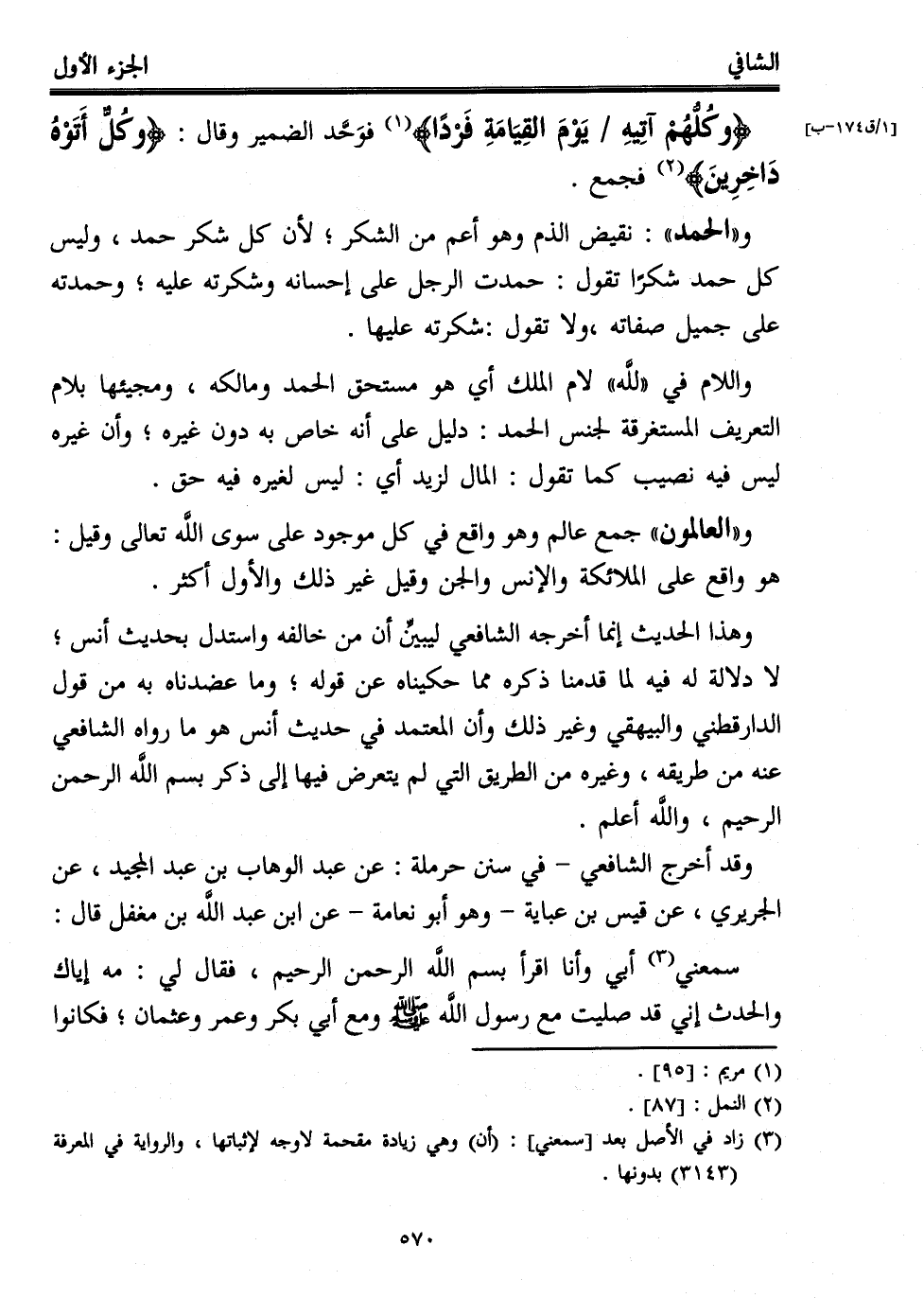وهذا الحديث إنما أخرجه الشافعي ليبيِّن أن من خالفه واستدل بحديث أنس؛ لا دلالة له فيه لما قدمنا ذكره مما حكيناه عن قوله؛ وما عضدناه به من قول الدارقطني والبيهقي وغير ذلك وأن المعتمد في حديث أنس هو ما رواه الشافعي عنه من طريقه، وغيره من الطريق التي لم يتعرض فيها إلى ذكر بسم الله الرحمن الرحيم، والله أعلم.