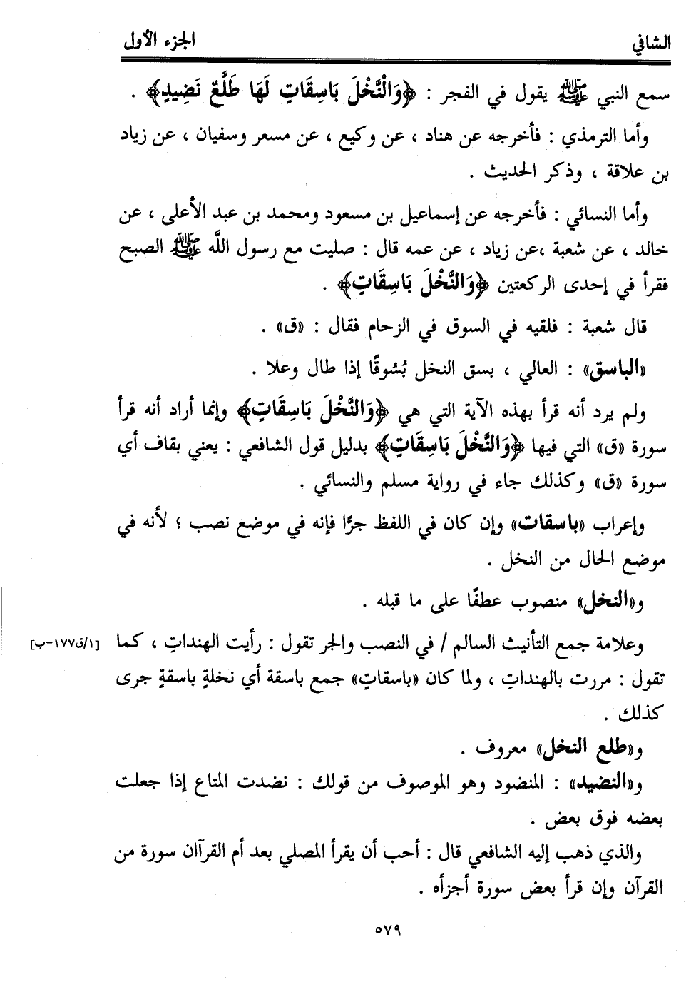 ولم يرد أنه قرأ بهذه الآية التي هي {وَالنَّخْلَ بَاسِقَاتٍ} وإنما أراد أنه قرأ سورة "ق" التي فيها {وَالنَّخْلَ بَاسِقَاتٍ} بدليل قول الشافعي: يعني بقاف أي سورة "ق" وكذلك جاء في رواية مسلم والنسائي.