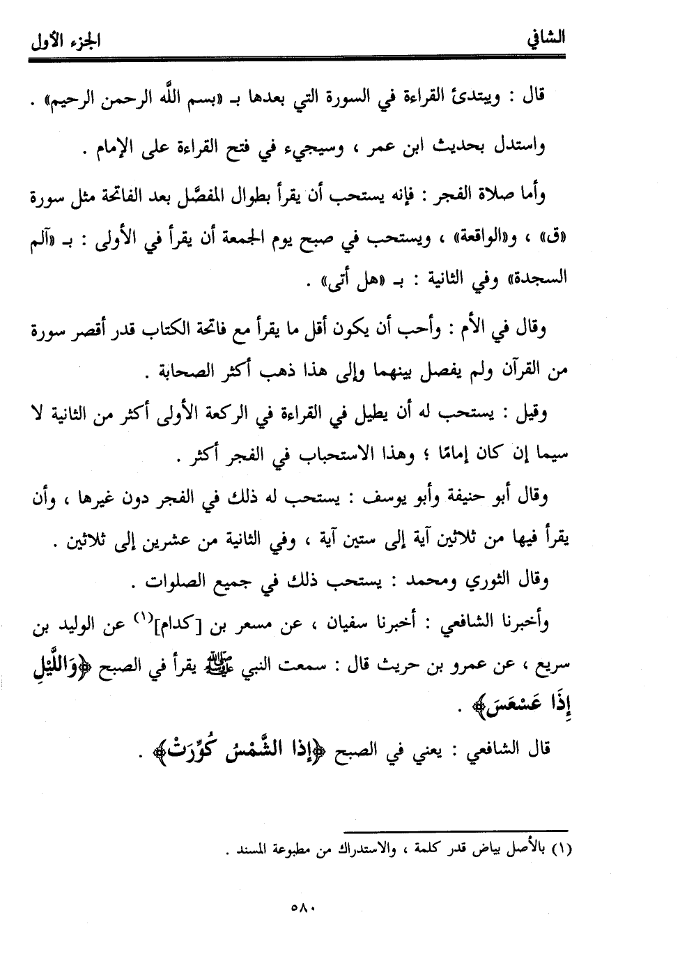 وأخبرنا الشافعي: أخبرنا سفيان، عن مسعر بن [كدام] (¬1) عن الوليد بن سريع، عن عمرو بن حريث قال: سمعت النبي - صلى الله عليه وسلم - يقرأ في الصبح {وَاللَّيْلِ إِذَا عَسْعَسَ}.