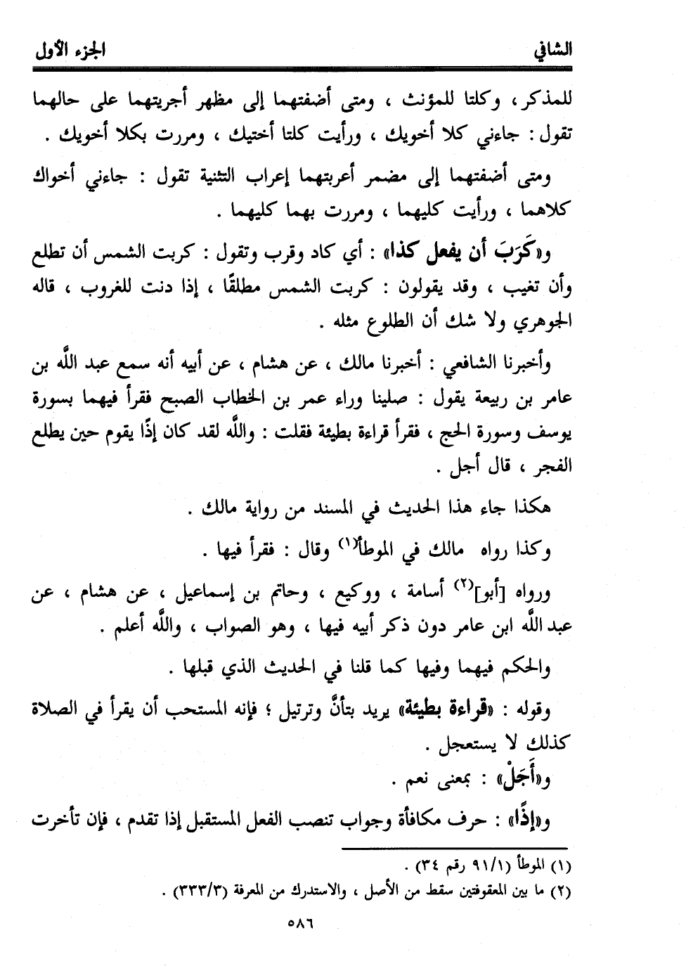 وأخبرنا الشافعي: أخبرنا مالك، عن هشام، عن أبيه أنه سمع عبد الله بن عامر بن ربيعة يقول: صلينا وراء عمر بن الخطاب الصبح فقرأ فيهما بسورة يوسف وسورة الحج، فقرأ قراءة بطيئة فقلت: والله لقد كان إذًا يقوم حين يطلع الفجر، قال أجل.
