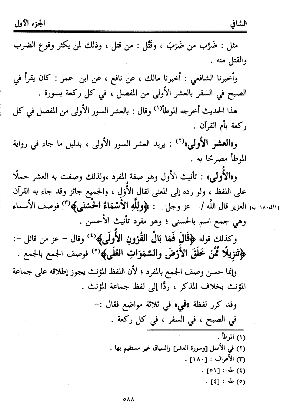 و"الأُولى": تأنيث الأول وهو صفة المفرد، ولذلك وصفت به العشر حملًا على اللفظ، ولو رده إلى المعنى لقال الأُوَلِ، والجميع جائز وقد جاء به القرآن العزيز قال الله -عز وجل-: {وَلِلَّهِ الْأَسْمَاءُ الْحُسْنَى} (¬3) فوصف الأسماء وهي جمع اسم بالحسنى؛ وهو مفرد تأنيث الأحسن.