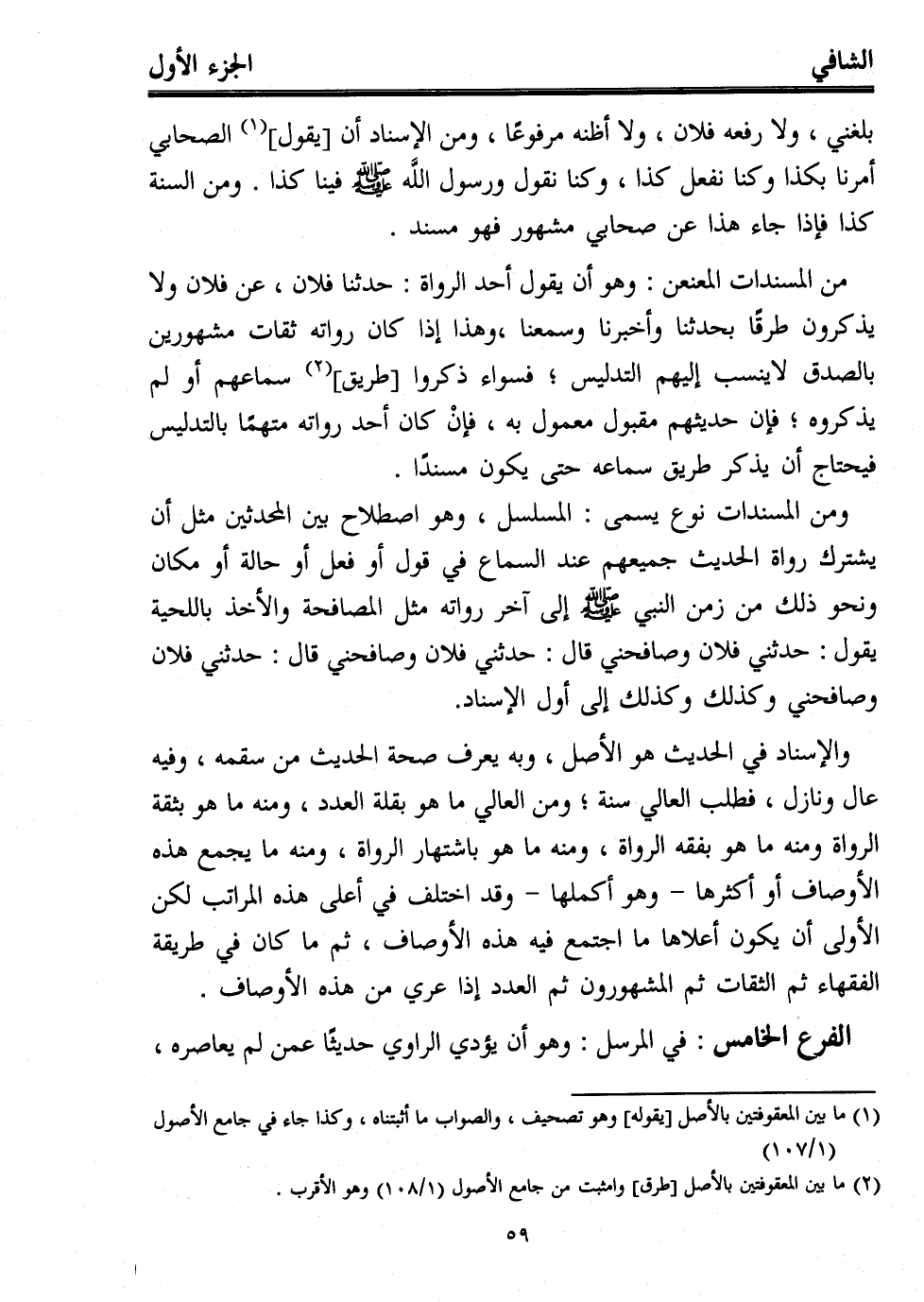 والإسناد في الحديث هو الأصل، وبه يعرف صحة الحديث من سقمه، وفيه عال ونازل، فطلب العالي سنة؛ ومن العالي ما هو بقلة العدد، ومنه ما هو بثقة الرواة ومنه ما هو بفقه الرواة، ومنه ما هو باشتهار الرواة، ومنه ما يجمع هذه الأوصاف أو أكثرها -وهو أكملها- وقد اختلف في أعلى هذه المراتب لكن الأولى أن يكون أعلاها ما اجتمع فيه هذه الأوصاف، ثم ما كان في طريقة الفقهاء ثم الثقات ثم المشهورون ثم العدد إذا عري من هذه الأوصاف.