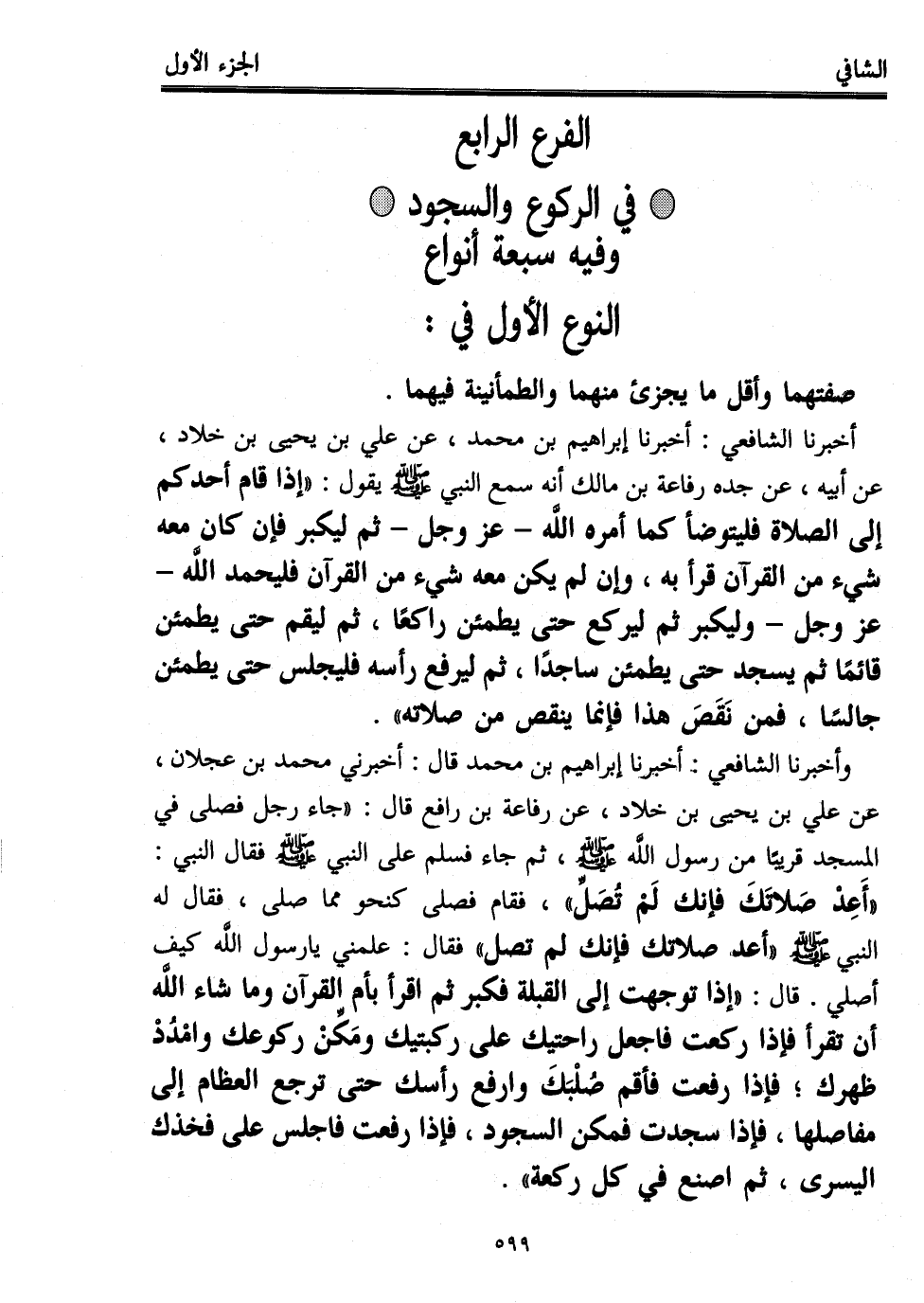 وأخبرنا الشافعي: أخبرنا إبراهيم بن محمد قال: أخبرني محمد بن عجلان، عن علي بن يحيى بن خلاد، عن رفاعة بن رافع قال: "جاء رجل فصلى في المسجد قريبًا من رسول الله - صلى الله عليه وسلم -، ثم جاء فسلم على النبي - صلى الله عليه وسلم - فقال النبي: "أَعِدْ صَلاتَكَ فإنك لَمْ تُصَلِّ"، فقام فصلى كنحو مما صلى، فقال له النبي - صلى الله عليه وسلم - "أعد، صلاتك فإنك لم تصل" فقال: علمني يا رسول الله كيف أصلي. قال: "إذا توجهت إلى القبلة فكبر ثم اقرأ بأم القرآن وما شاء الله أن تقرأ فإذا ركعت فاجعل راحتيك على ركبتيك ومَكِّنْ ركوعك وامْدُدْ ظهرك؛ فإذا رفعت فأقم صُلْبَكَ وارفع رأسك حتى ترجع العظام إلى مفاصلها، فإذا سجدت فمكن السجود، فإذا رفعت فاجلس على فخذك اليسرى، ثم اصنع في كل ركعة".