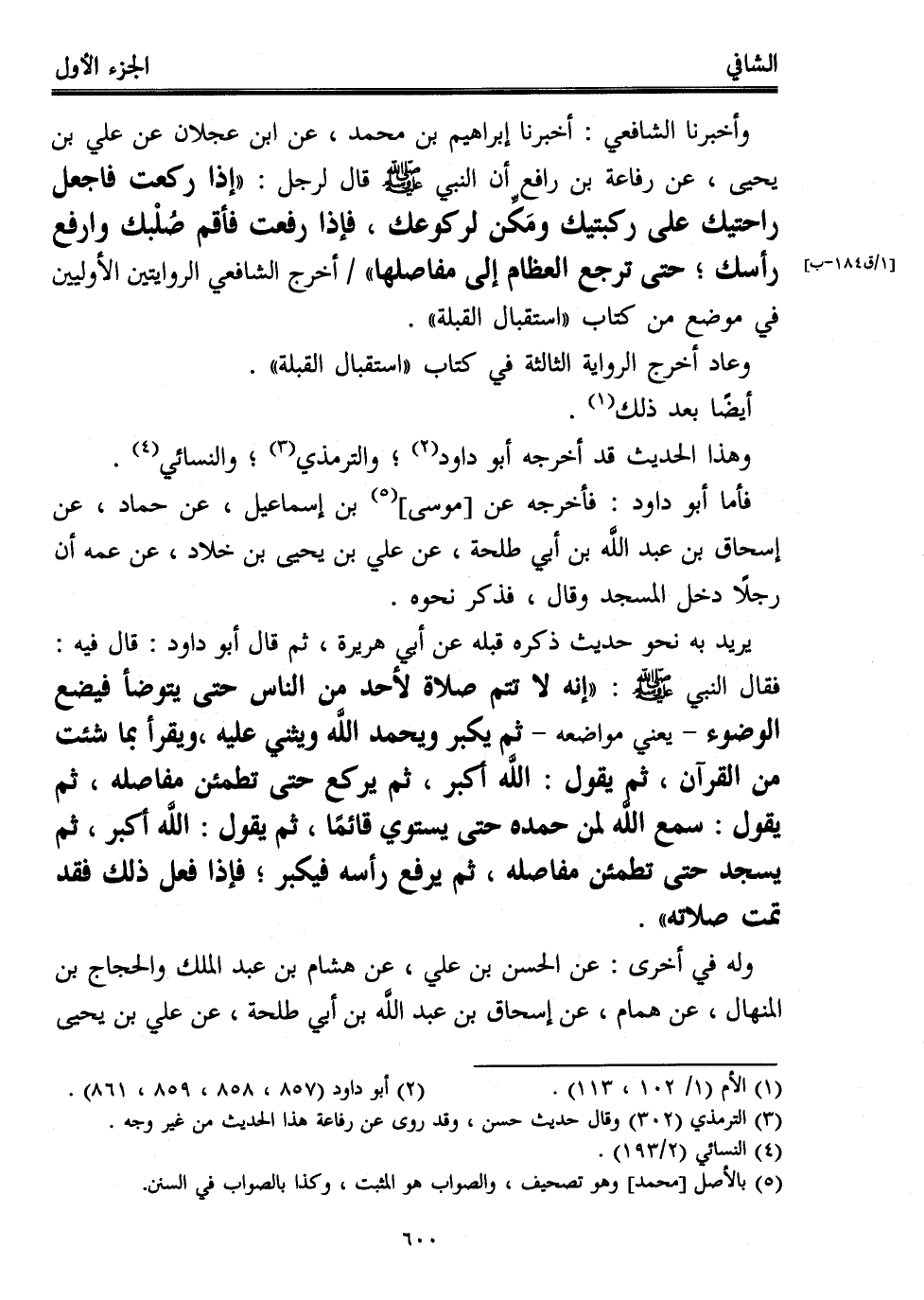 وأخبرنا الشافعي: أخبرنا إبراهيم بن محمد، عن ابن عجلان عن علي بن يحيى، عن رفاعة بن رافع أن النبي - صلى الله عليه وسلم - قال لرجل: "إذا ركعت فاجعل راحتيك على ركبتيك ومَكِّن لركوعك، فإذا رفعت فأقم صُلْبك وارفع رأسك؛ حتى ترجع العظام إلى مفاصلها" أخرج الشافعي الروايتين الأوليين في موضع من كتاب "استقبال القبلة".