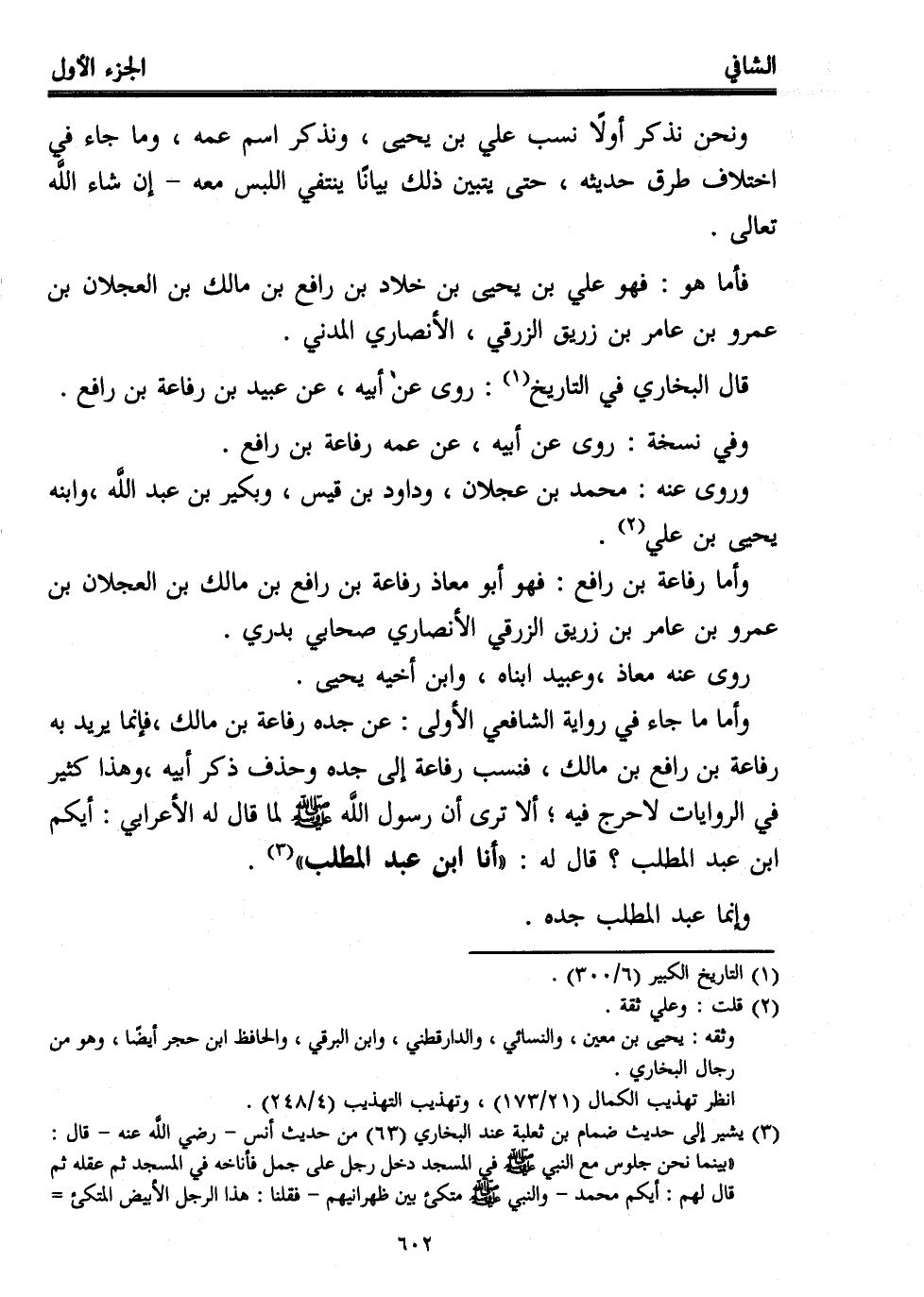 وأما ما جاء في رواية الشافعي الأولى: عن جده رفاعة بن مالك، فإنما يريد به رفاعة بن رافع بن مالك، فنسب رفاعة إلى جده وحذف ذكر أبيه، وهذا كثير في الروايات لا حرج فيه؛ ألا ترى أن رسول الله - صلى الله عليه وسلم - لما قال له الأعرابي: أيكم ابن عبد المطلب؟ قال له: "أنا ابن عبد الطلب" (¬3).