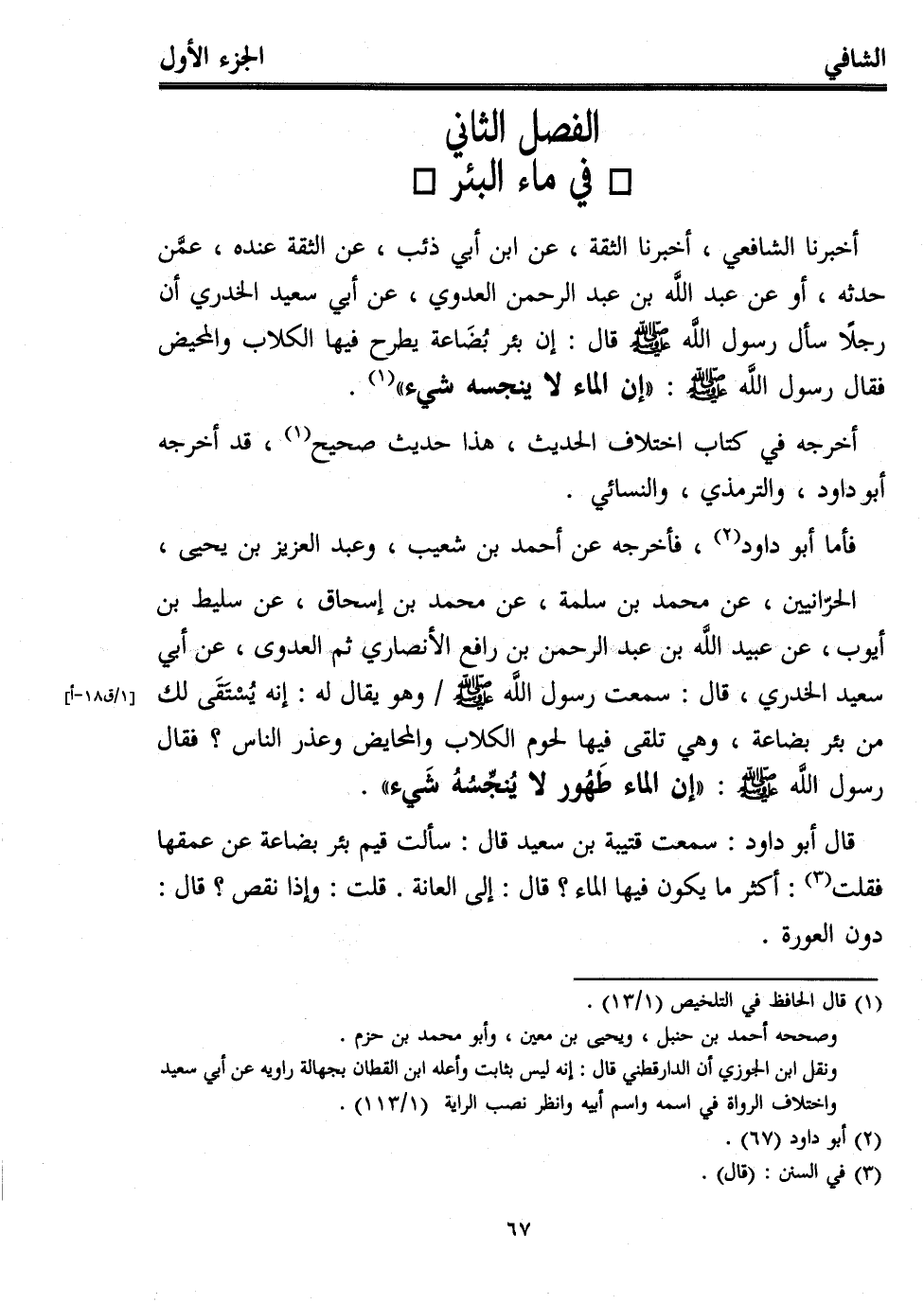 فأما أبو داود (¬2)، فأخرجه عن أحمد بن شعيب، وعبد العزيز بن يحيى، الحرّانيين، عن محمد بن سلمة، عن محمد بن إسحاق، عن سليط بن أيوب، عن عبيد اللَّه بن عبد الرحمن بن رافع الأنصاري ثم العدوى، عن أبي سعيد الخدري، قال: سمعت رسول اللَّه - صلى الله عليه وسلم - وهو يقال له: إنه يُسْتَقَى لك من بئر بضاعة، وهي تلقى فيها لحوم الكلاب والمحايض وعذر الناس؟ فقال رسول الله - صلى الله عليه وسلم -: "إن الماء طَهُور لا يُنجِّسُهُ شَيء".