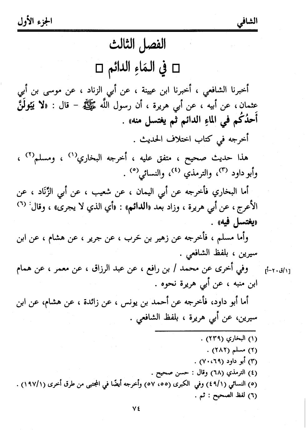 أخبرنا الشافعي، أخبرنا ابن عيينة، عن أبي الزناد، عن موسى بن أبي عثمان، عن أبيه، عن أبي هريرة، أن رسول اللَّه - صلى الله عليه وسلم - قال: "لا يَبُولَنَّ أَحدُكُم في الماءِ الدائم ثم يغتسل منه".